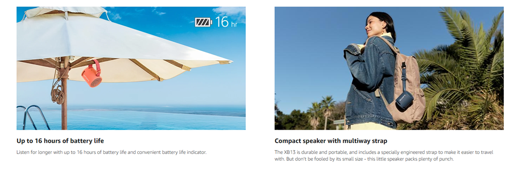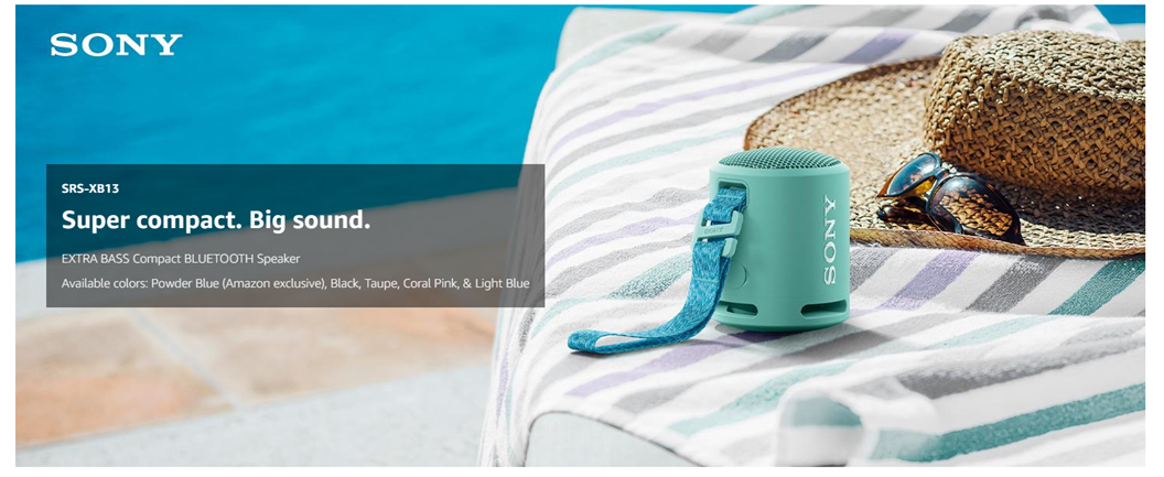 Enjoy big sound with the super-compact SRS-XB13 wireless speaker, featuring EXTRA BASS™, an updated IP67 waterproof and dustproof design1,2, and up to 16 hours of battery life.3 Small enough to fit in a bag or cupholder, the XB13 also features a multiway strap to take it with you everywhere you go.