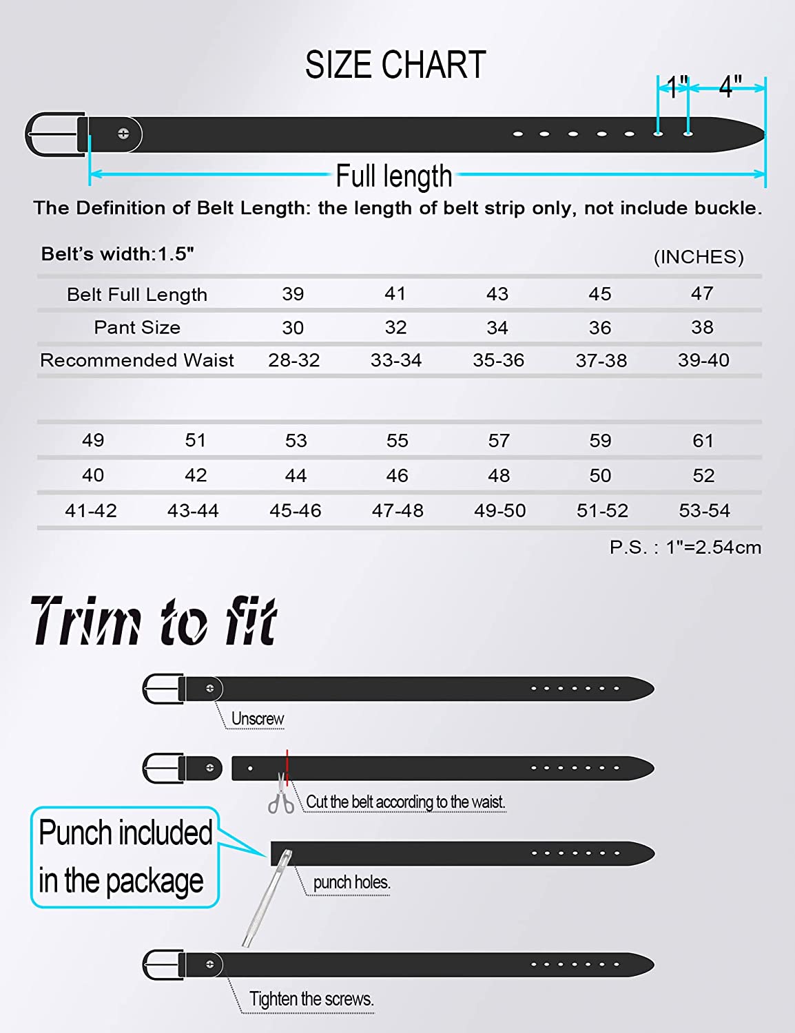 [Perfect Fit]: There are 7 holes on the mens belt to make belt fits more waistline size. Each product comes with a puncher so that you can remove the belt head to adjust the belt length according to your waist size.
