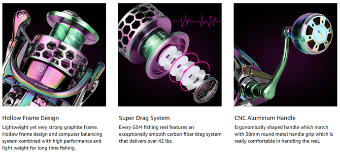 - 【Rigid aluminum skeletal frame】 The Sougayilang GSM spin fishing reel is built for enormous strength and endless durability. The frame is a machined of aircraft grade aluminum to reduce weight and deliver long, accurate casts. It’s the basis for its strength to battle hard fighting fish in fresh and saltwater.