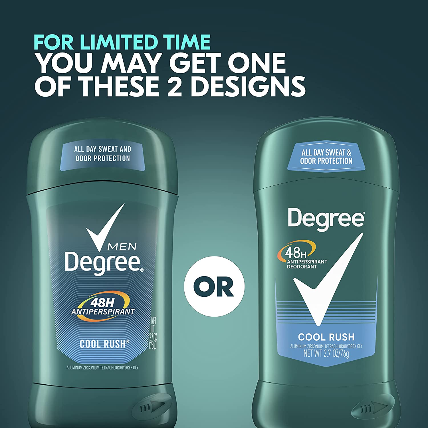 Degree Cool Rush helps keep you fresh and dry, no matter what. This mens antiperspirant has 48H non-stop protection, non-stop confidence with a scent that combines an energizing burst of crisp, arctic freshness in Cool Rush men’s fragrance and. Whether you’re having a long day in the office, playing sports outdoors or working out in the gym, you can be confident that with this mens deodorant you’ll be protected from underarm sweat and body odor. It comes in an easy-to-use applicator stick - you simply turn the dial to raise the stick, apply a thin layer to your underarms, and you’re ready for anything. Every time you move, Degree men antiperspirant deodorant keeps you fresh and free from strong body odor and underarm sweat. This powerful antiperspirant deodorant responds when you need it most. Whatever you do, however you do it, Degree wants to help inspire the confidence in you to move more, and with this deodorant for men, it’ll provide you the confidence that sweat and odor will not get in your way of your progress. Degree. It won’t let you down.