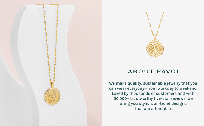 ✦ SUSTAINABILITY ✦ PAVOI is dedicated to sustainability throughout our entire product cycle. Our jewelry is made from 100% recycled materials and we package in 99% recycled and compostable materials. We work to reduce our carbon emissions and offset plastic consumption by removing 275,000 bottles from oceans annually. We are committed to maintain a balanced and eco-friendly business that minimizes our environmental impact. Trust that PAVOI is continuously working towards a greener future.