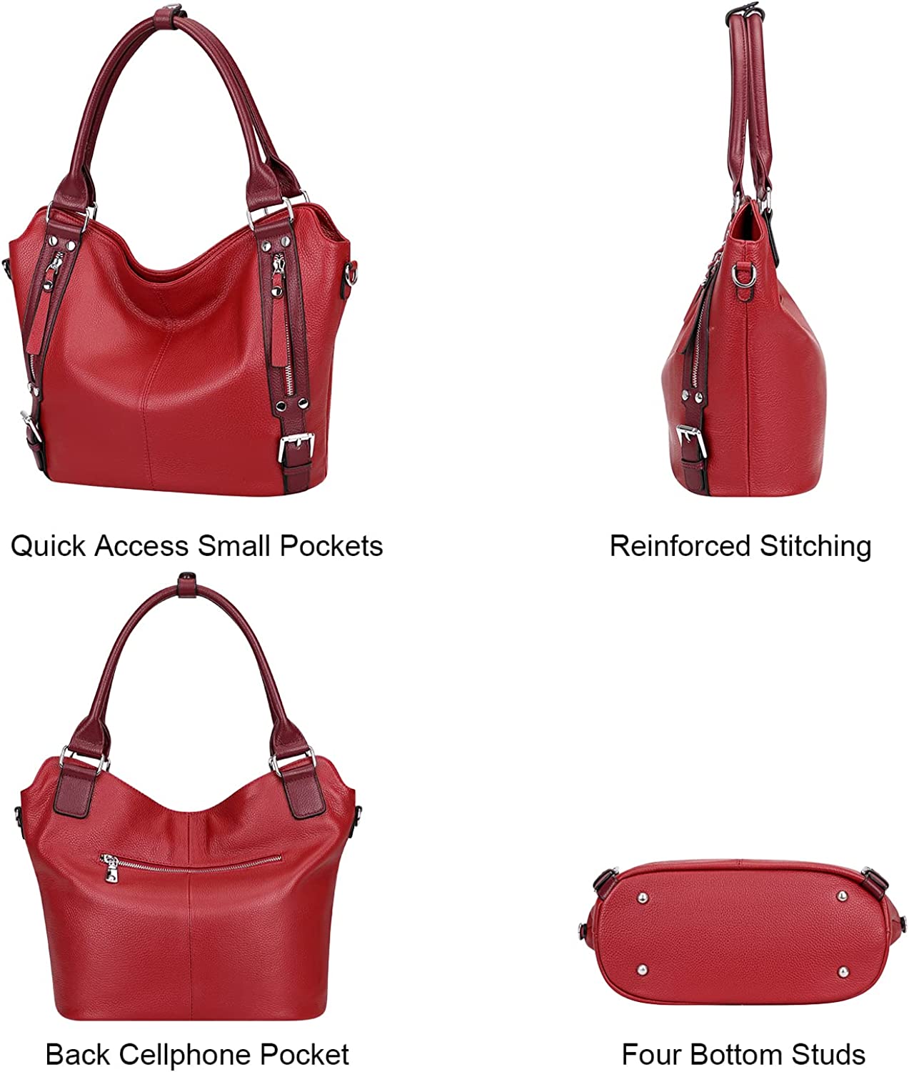 GENUINE LEATHER -- SOFT Leather large hobo tote purse made of genuine leather with pebble texture; The silver handware is high quality and durable. Bottom with 4 rivets for protecting your handbags bottom away from abrasion.