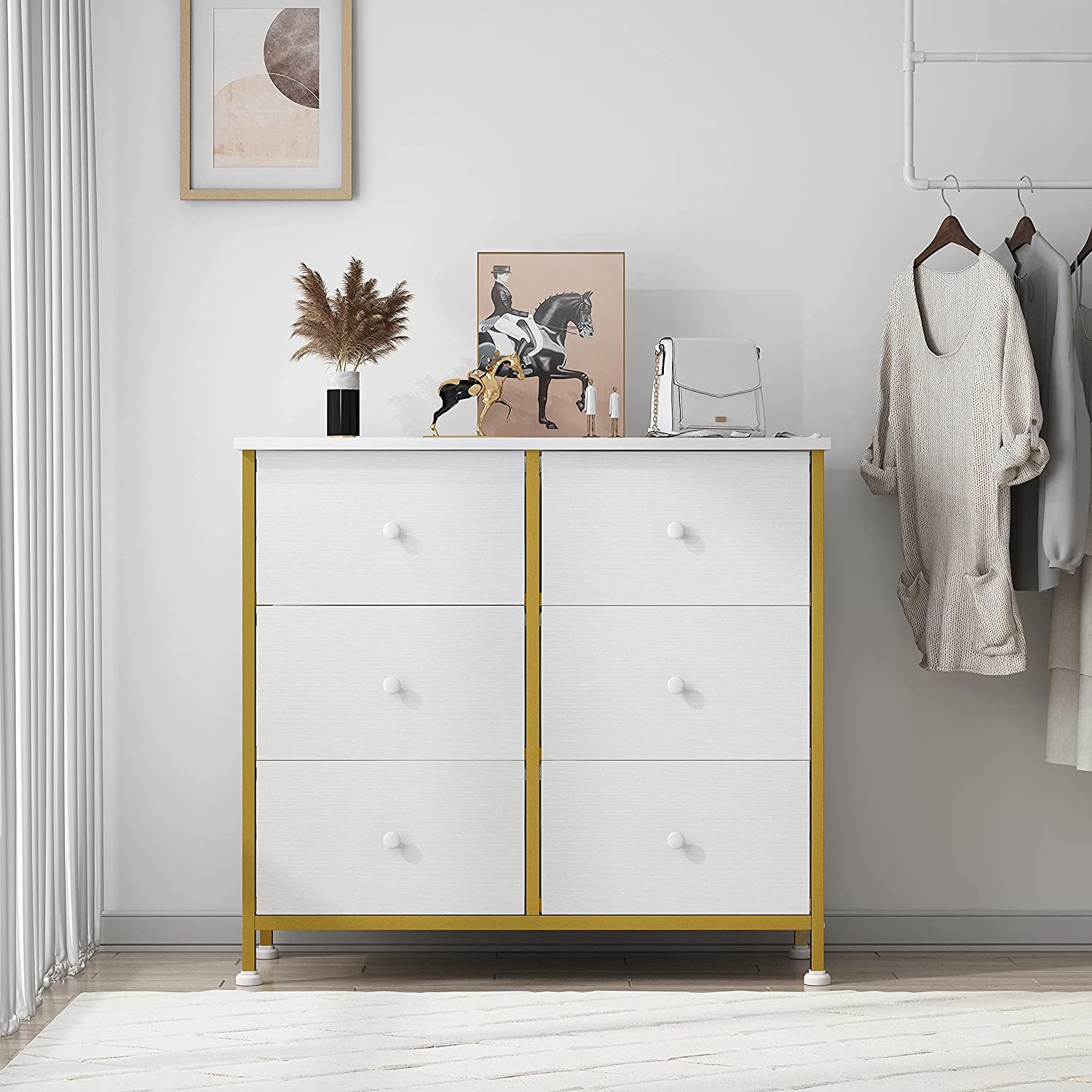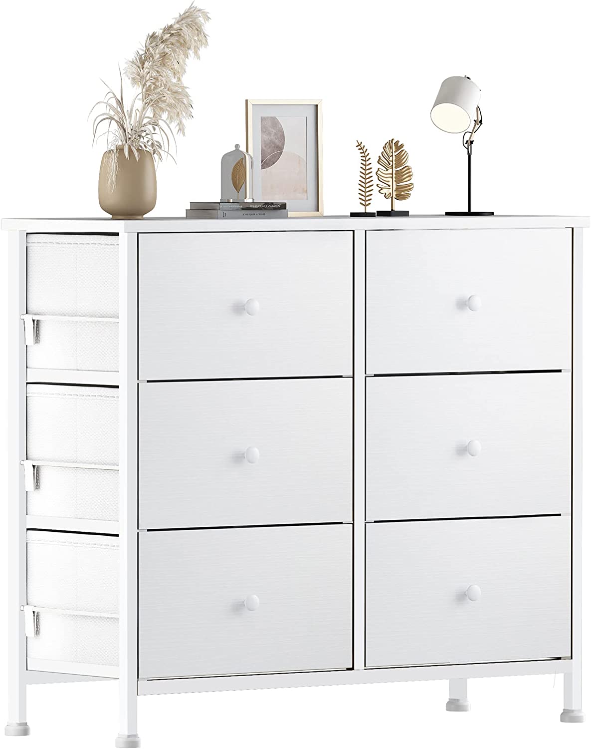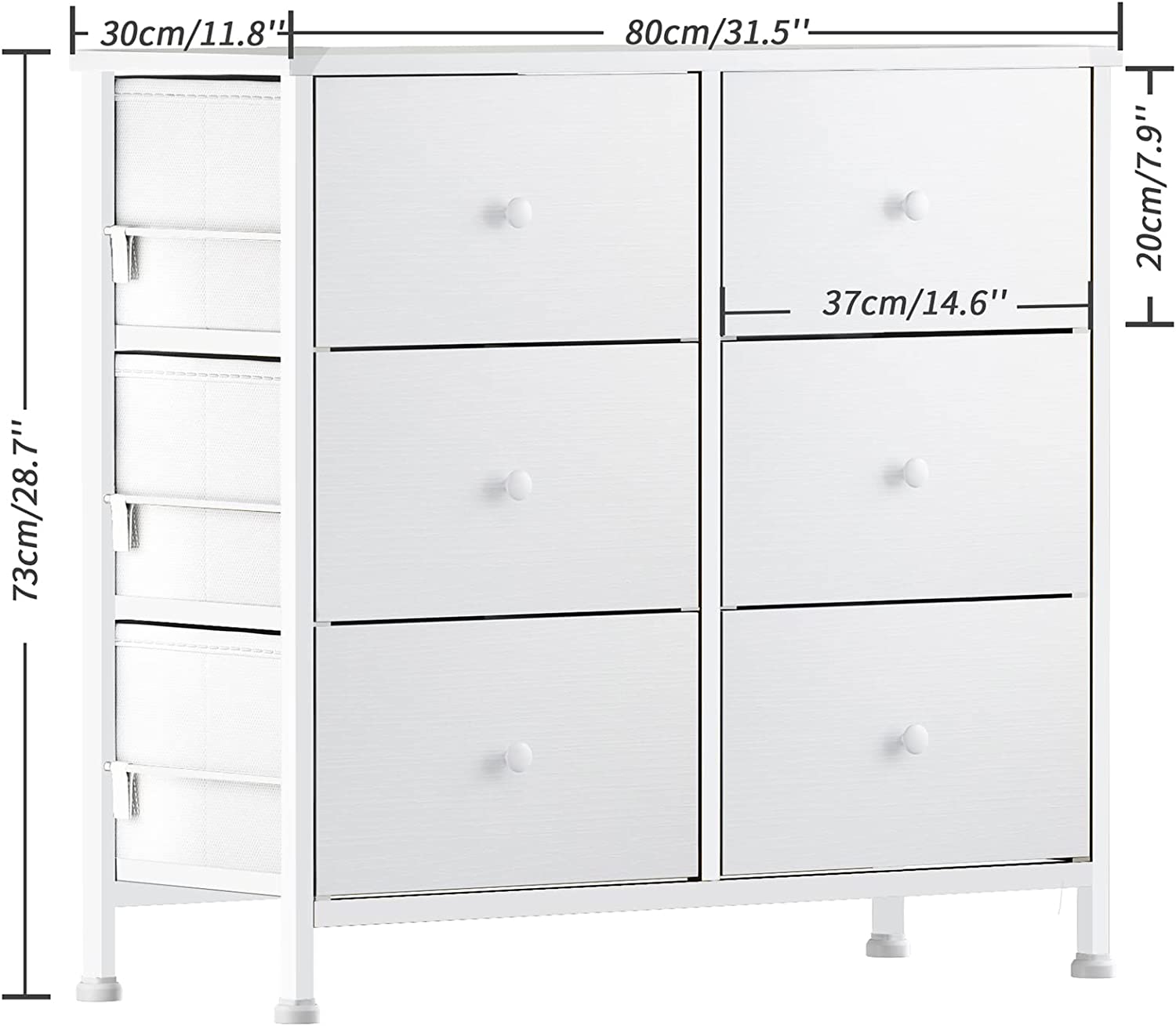 [White Dressers & Chests of Drawers]: Features 6 removable storage drawers made of high-quality non-woven fabrics, wooden front , Wooden handle is not only convenient but also beautiful,no matter kids or adult. Overall dimension: 31.5''*11.8''*28.7''.Drawer dimension: 14.6’’*11.8’’*7.9’’.