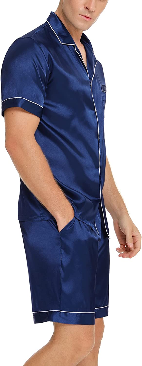 - FEATURES - Men satin 2 piece Pjs set with short sleeved button-down top and elastic waist pants, easy to put on and off. Classic notch collar, chest pocket lend sophisticated detail. Sleepwear with pockets to place your phone and wallet. Satin silk pajamas features contrast color, makes you more decorous.
