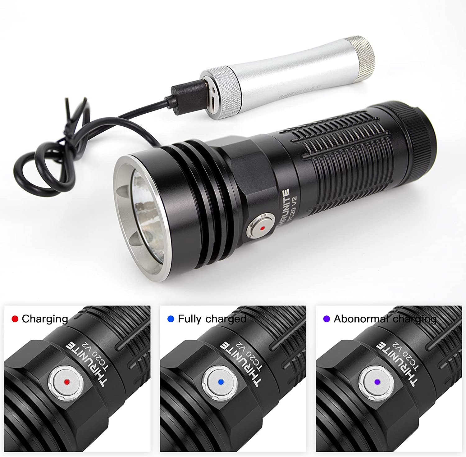 Rechargeable functionMax 2A USB-C charging. During charging, the indicator is RED. After being fully charged, the indicator will be BLUE.When indicator flashes purple, it means abnormal charging. Only firefly, low and medium modes are available while charging.