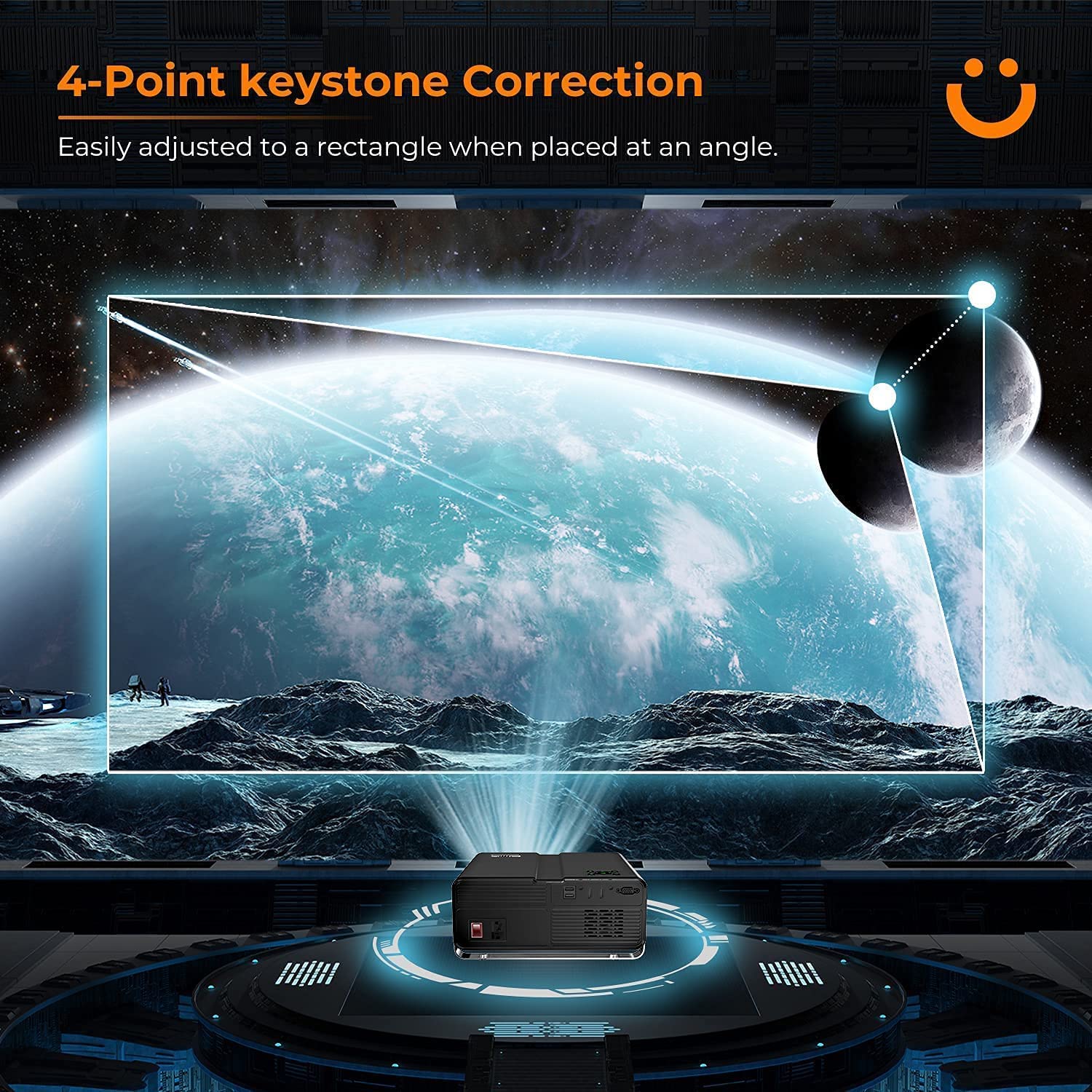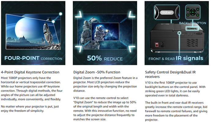 • ?[4-Point Keystone Correction & 50% ZOOM Function] With upgraded 4-Point keystone correction, V10 wifi and Bluetooth projector can achieve a higher level of precision correction. The four corners of the image can be adjusted separately, not limited by the position of the video projector. The digital zoom function can reduce the image size from 100% to 50% by the remote without moving the movie projector.