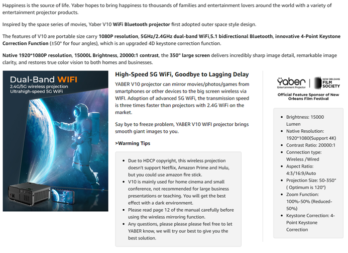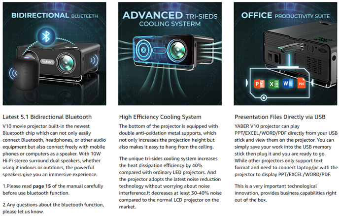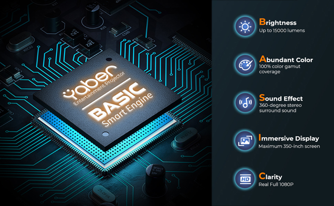 • ?[15000L 1080P & Support 4K & Space Style Design] V10 home theater projector is the first projector on the market that adopts high transmittance and refraction of lens with 15000L Brightness, 20000:1 high contrast. It brings wider color gamut, sharp and detailed images than other native 1080P projector. Also, V10 4k projector adopts the YABER 2.0 Smart Engine technology, with excellent UI design makes the operation of the product more user-friendly.