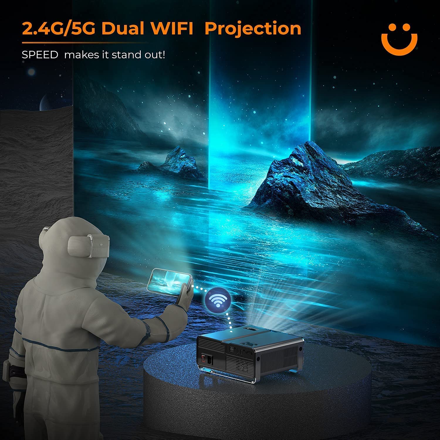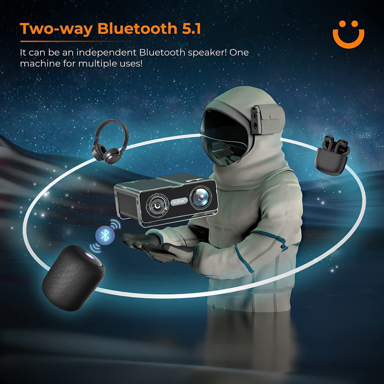 • ⚡[Bidirectional 5.1 Bluetooth& 5G/2.4G WIFI] Official Feature Sponsor of New Orleans Film Festival-YABER V10 Bluetooth projector built-in the latest bidirectional Bluetooth 5.1 chip and stereo surround speaker, which not only can connect your Bluetooth speakers wireless but also can be connected to the mobile phone as a speaker at any time freely. With ultra-fast &stable 5G wifi, the V10 wifi projector can mirror videos/photos/games from smartphones or other devices to the big screen freely.