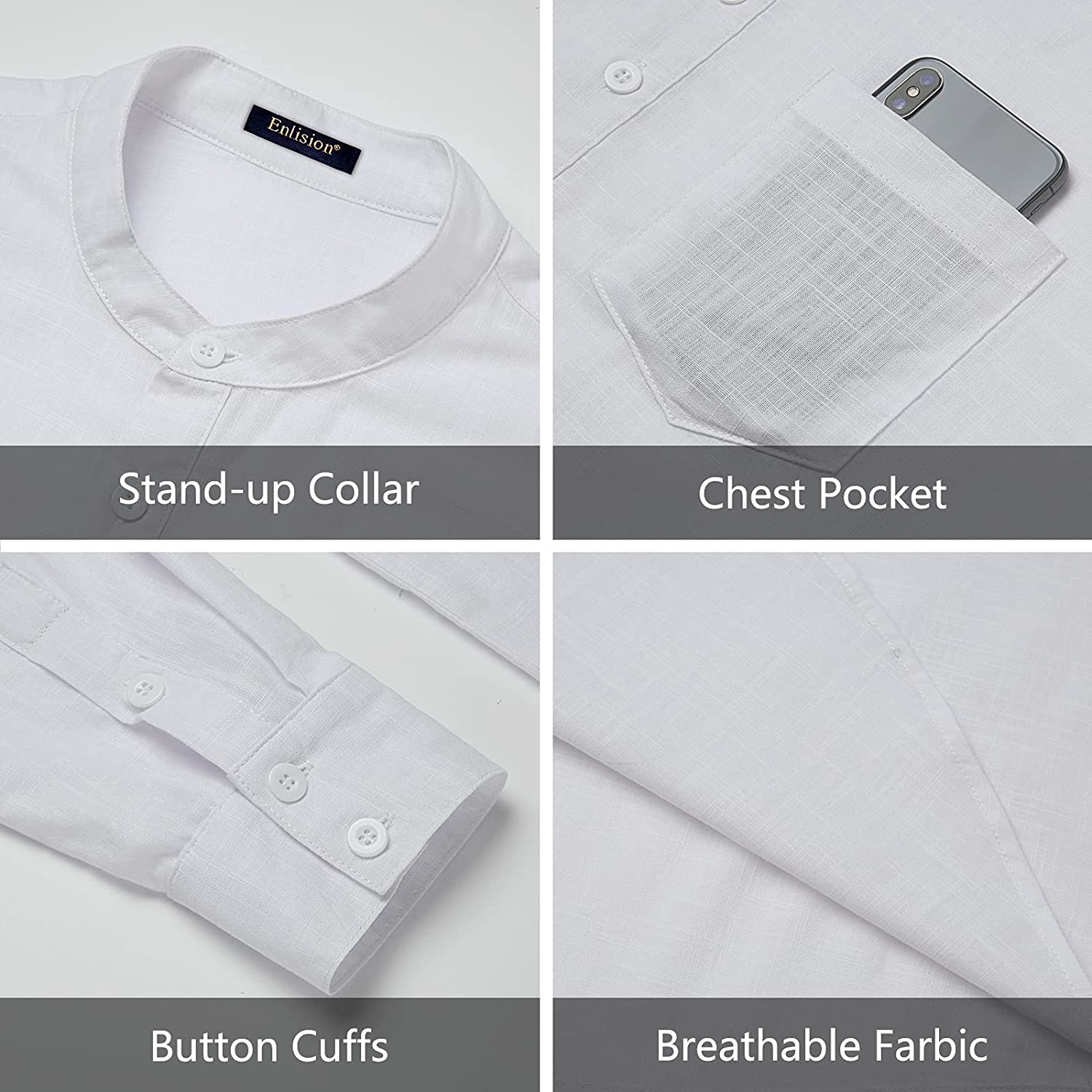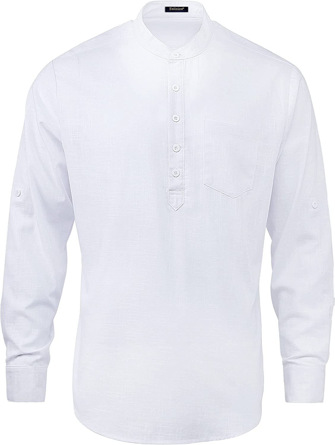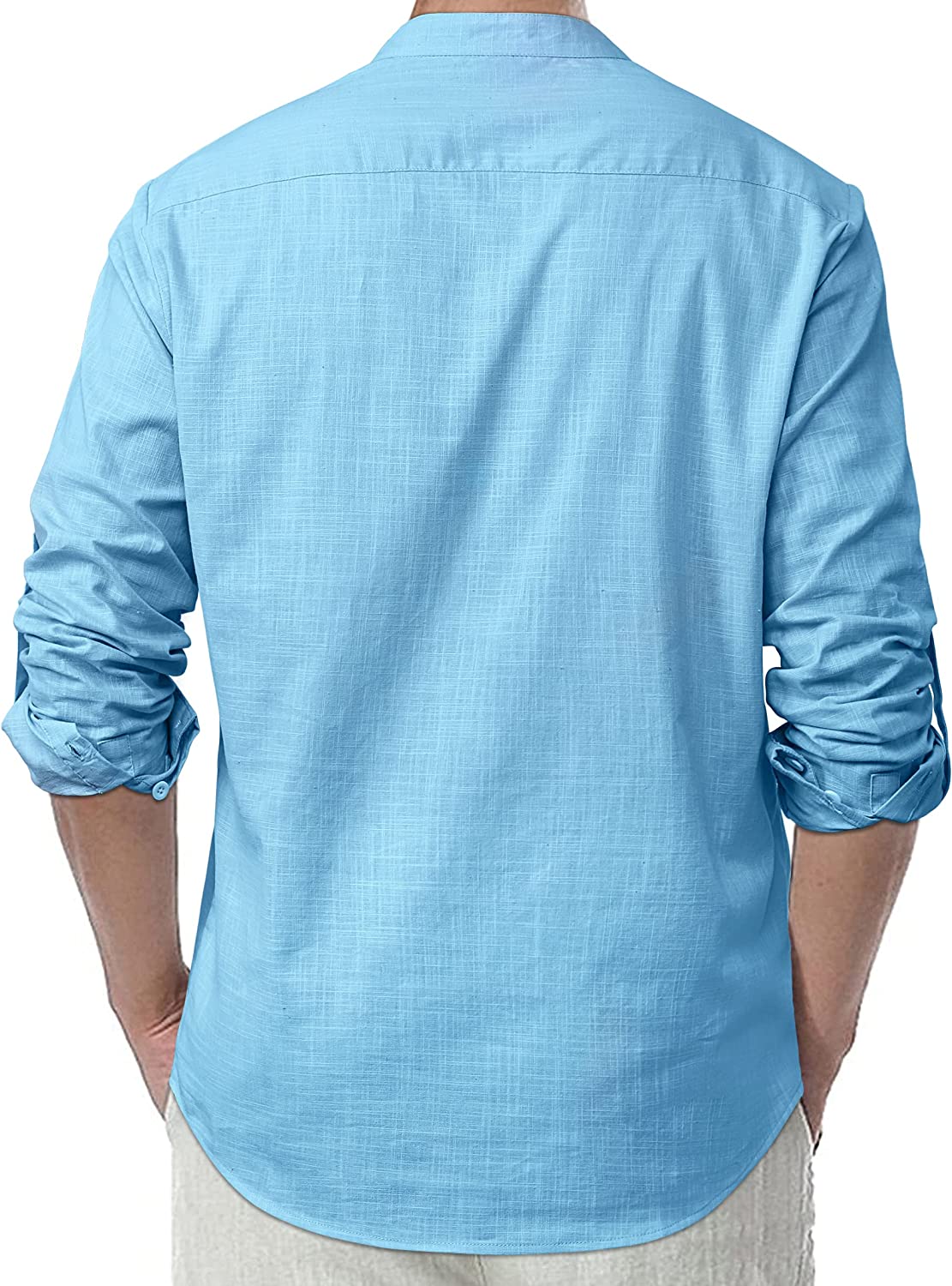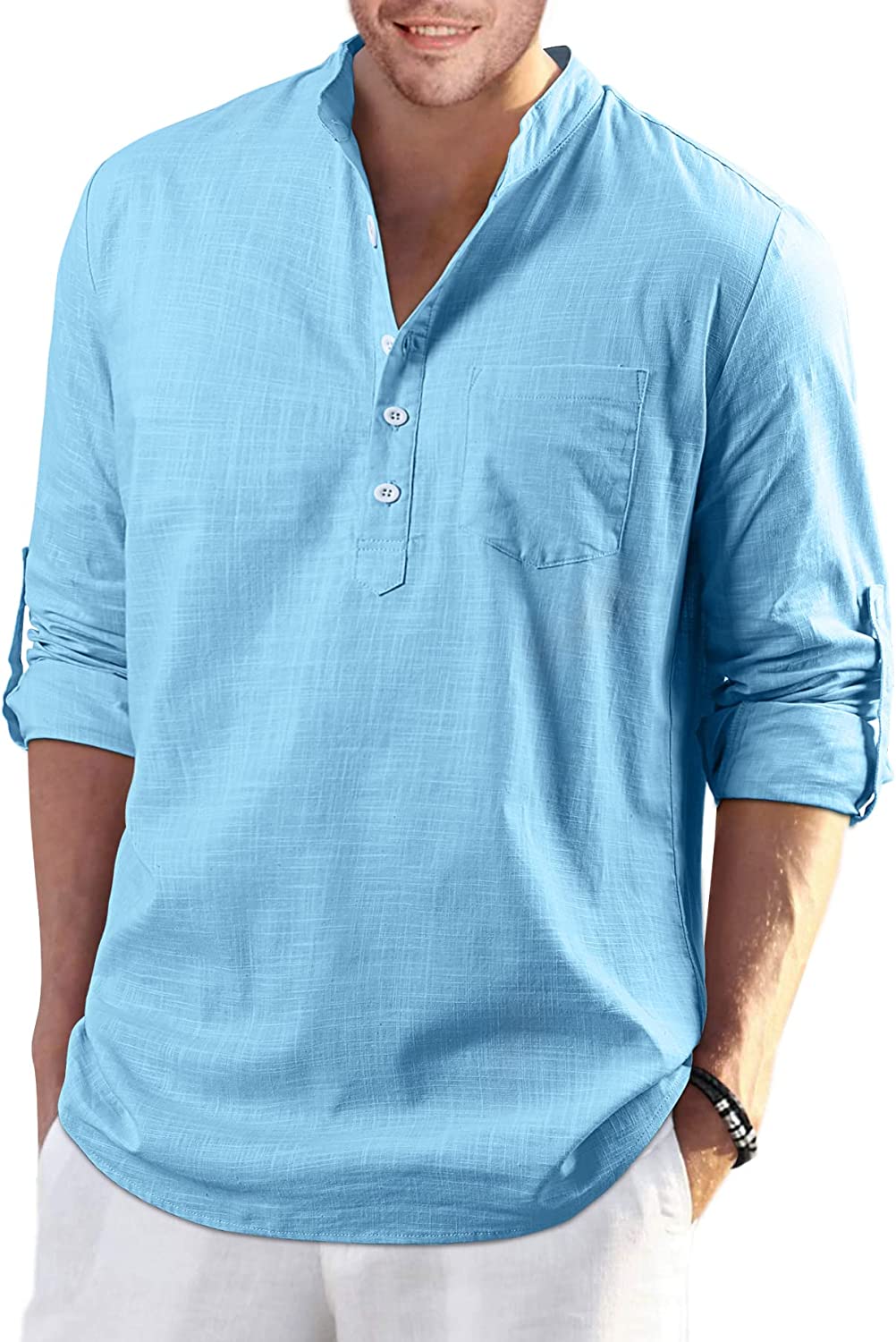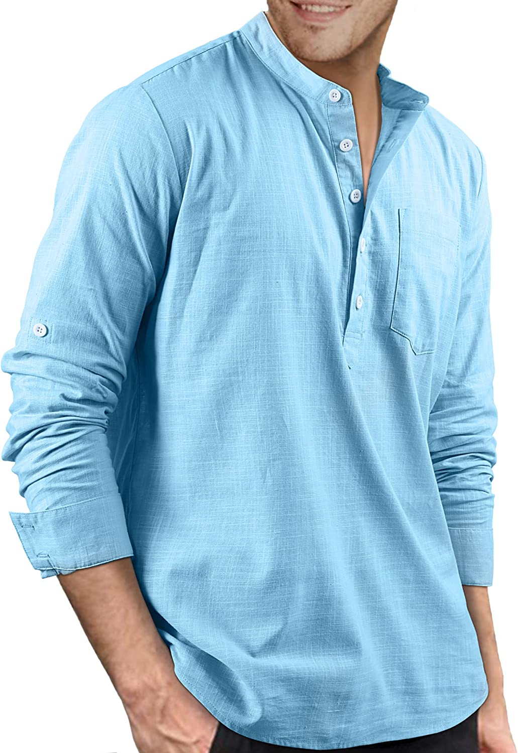 【DESIGN】: Casual hippie beach linen shirt, simple style, long-sleeved collarless, rolled sleeves, 5 front buttons, a real pocket, solid color, round hem, loose fit and lightable.