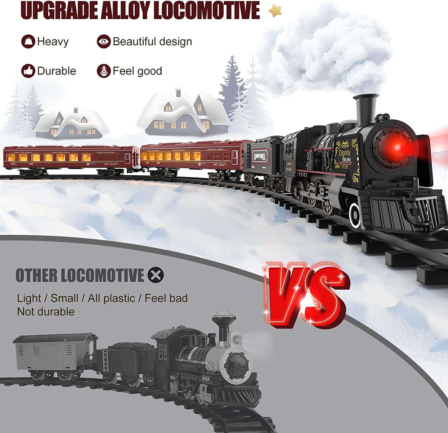 - ?【ALLOY MATERIAL,SAFE & DURABLE】: Both the locomotive steam and carriage wheels are made of alloy materials, which are non-toxic and tasteless, and every component has undergone strict quality control, it is safe enough for kids. Compared to the plastic toy train on Amazon, our alloy electric train sets for kids are more durable and impact-resistant. The smooth design of the train sets for boys 8-14 will not harm the child's hands or body. You can play with your children with confidence.
