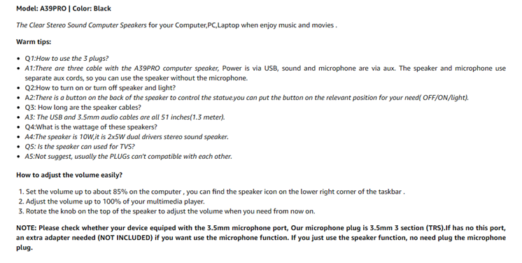 - Volume controls at Ease: Volume knob on the top of the A39PRO PC Speaker,not in the line as other speakers, you can control for instant adjustments at ease.