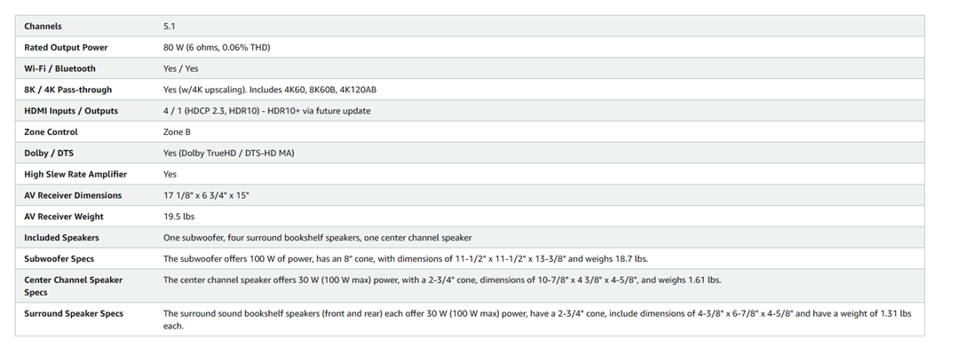 Enjoy a complete home theater with the YHT-5960U. This 5.1-channel surround sound system will transform how you listen and watch at home with a powerful subwoofer and complete set of surround speakers. The YHT-5960U home-theater-in-a-box includes an AV receiver with the latest in video processing, Dolby TrueHD, DTS-HD Master Audio, wireless streaming and more.