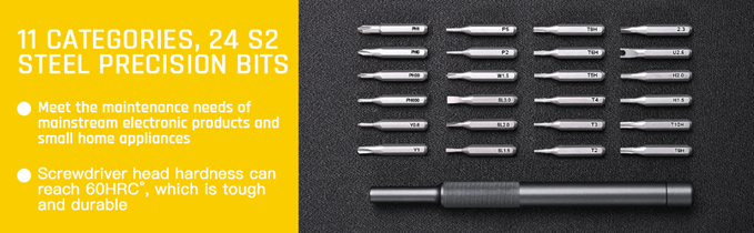 | Included Components | 24*S2 steel magnetic precision bit heads: PH1, 0, 000, 00; SL2, 1.5; T8H; T10H; T5H; T6H; T9H; H2, 0.7, 0.9, 1.5; T2, 3, 4; P2, 5; W1.5; Y0.6, 1; 2.3 |