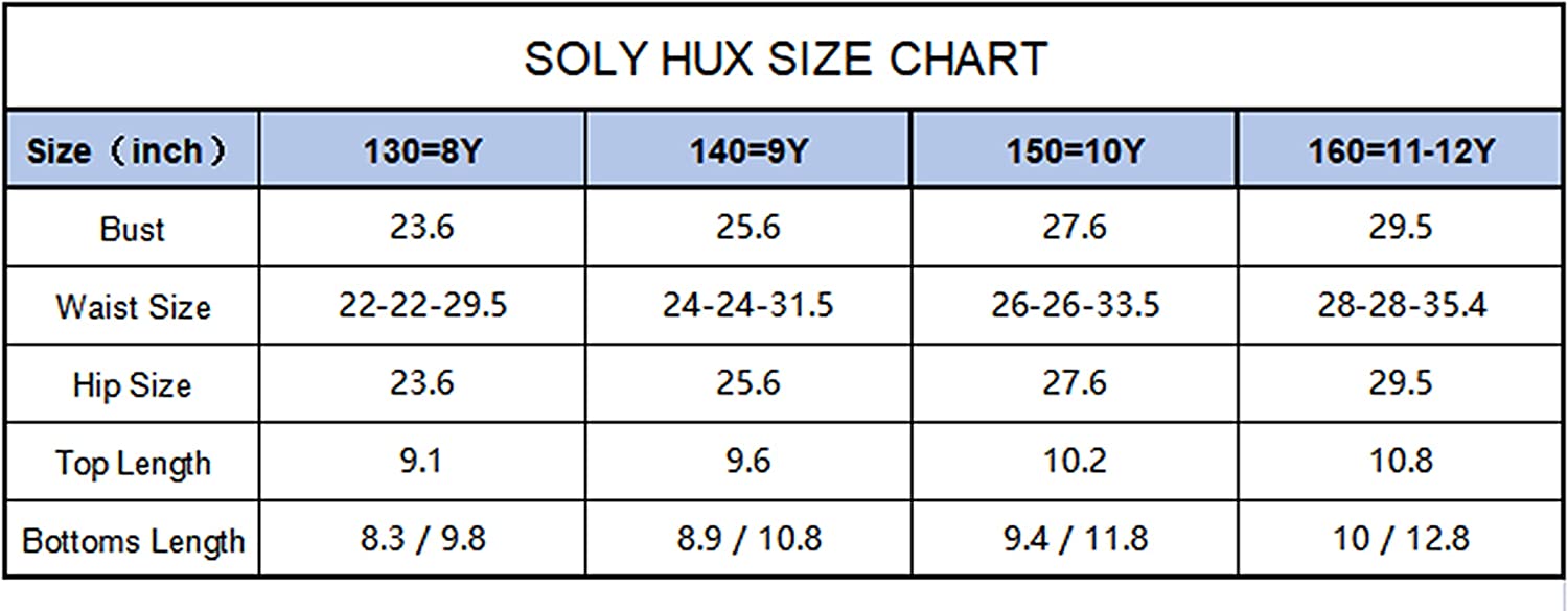 Size Chart:130=8Y: Bust: 22.8-30.7", Waist Size: 22-29.5/24-29.5", Hip Size: 24.4", Top Length: 9.1", Bottoms Length: 8.3 / 11.4", / 140=9Y: Bust: 24.8-32.7", Waist Size: 24-31.5/26-31.5", Hip Size: 26.4", Top Length: 9.6", Bottoms Length: 8.9 / 12.4", / 150=10Y: Bust: 26.8-34.6", Waist Size: 26-33.5/28-33.5", Hip Size: 28.3", Top Length: 10.2", Bottoms Length: 9.4 / 13.4", / 160=11-12Y: Bust: 28.7-36.6", Waist Size: 28-35.4/29.9-35.4", Hip Size: 30.3", Top Length: 10.8", Bottoms Length: 10 / 14.4"