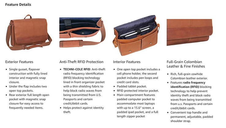 - The main compartment under the magnetic leather flap is perfect for holding documents, business essentials, or your laptop / tablet. Under the flap enclosure, you'll find two open pockets, a cell phone pocket, pen, an RFID protected pocket, and credit card slots. The rear pocket has magnetic enclosures for accessing frequently needed items.