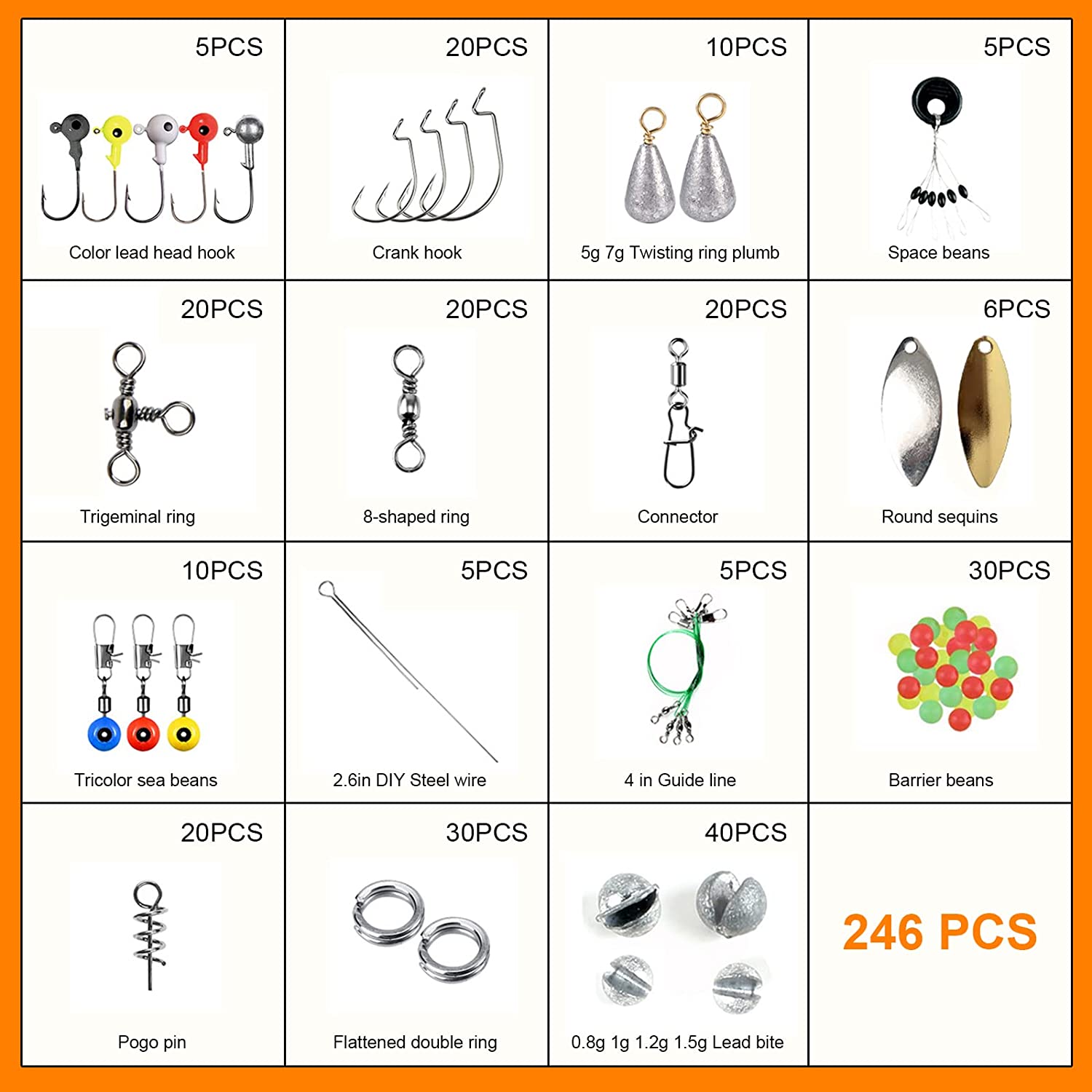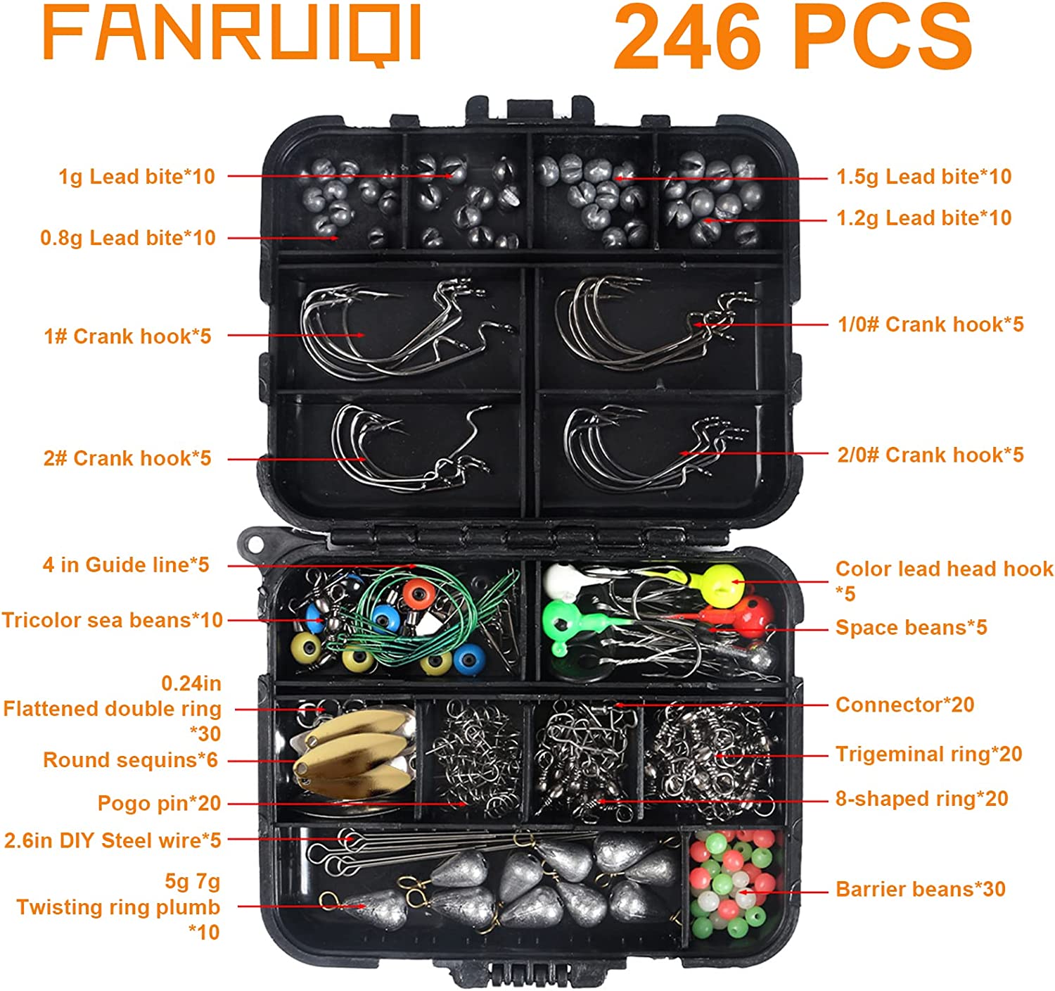 • VARIOUS FISHING ACCESSORIES- FRQ 246 pcs fishing tackles set collects nearly all accessories including Off set hooks/barrel swivels / barrel snap swivels/swivel slides/ Three way cross-line barrel swivels /Sequins/ split shot weights/fishing beads/ Barrel Swivel with Safety Snap/ Fishing Leaders/ Fishing Sinker Weights / Space Beans / suitable for all sorts of fishing conditions (About 0.09USD for each piece)
