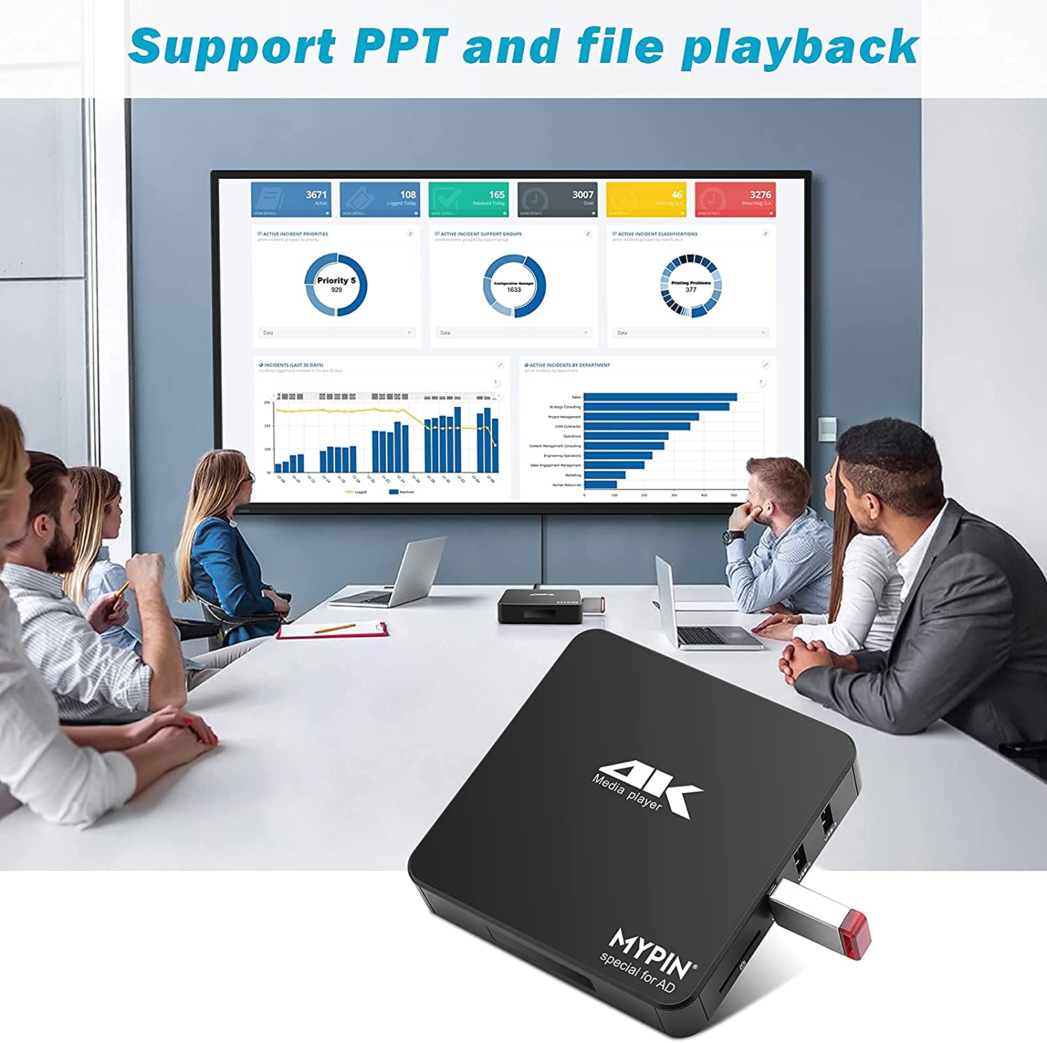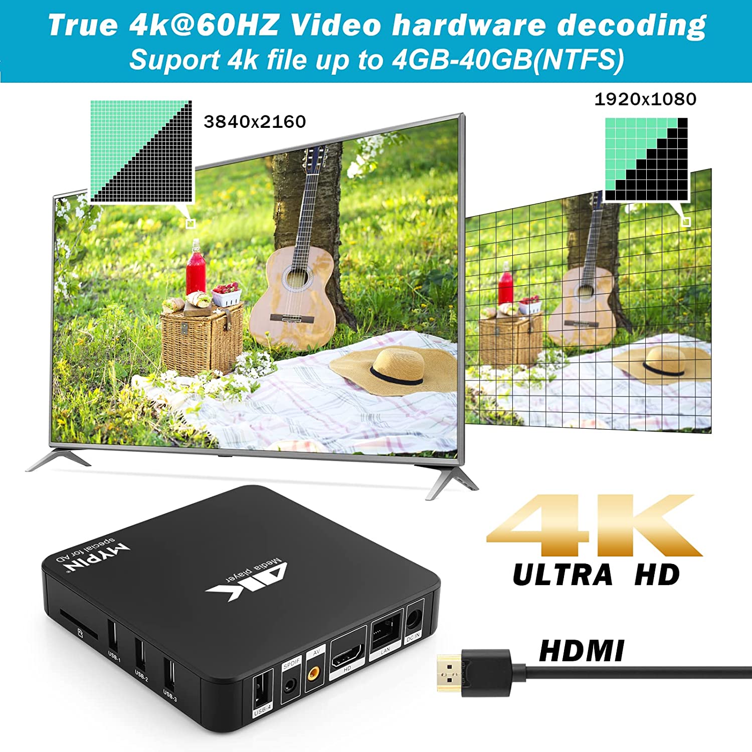 - 【Support Video/Picture/Music/PPT & Auto/loop mode playback】-- This 4k media player can play various popular videos, music, and photos. It has repeat playback,Automatic Playback and shuffles playback mode; It also reads PPT document. You can choose a variety of play mode: single, sequential. Especially for random playing video, music. Support video breakpoint and select mode from the beginning, you can start your home theater as you like. NOTE: NO random play for photos.