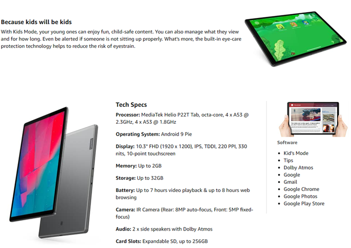 Lenovo Tab M10 FHD Plus (2nd Gen) - 2021 - Kids Mode Enablement - 10.3" FHD - Front 5MP & Rear 8MP Camera - 2GB Memory - 32GB Storage - Android 9 (Pie) or Later