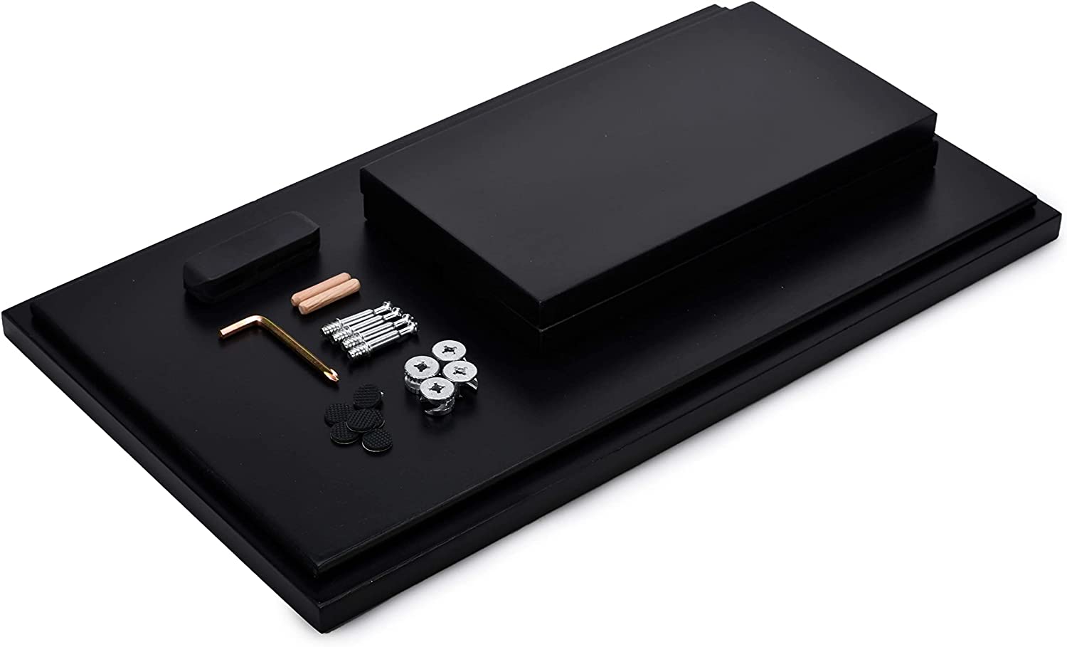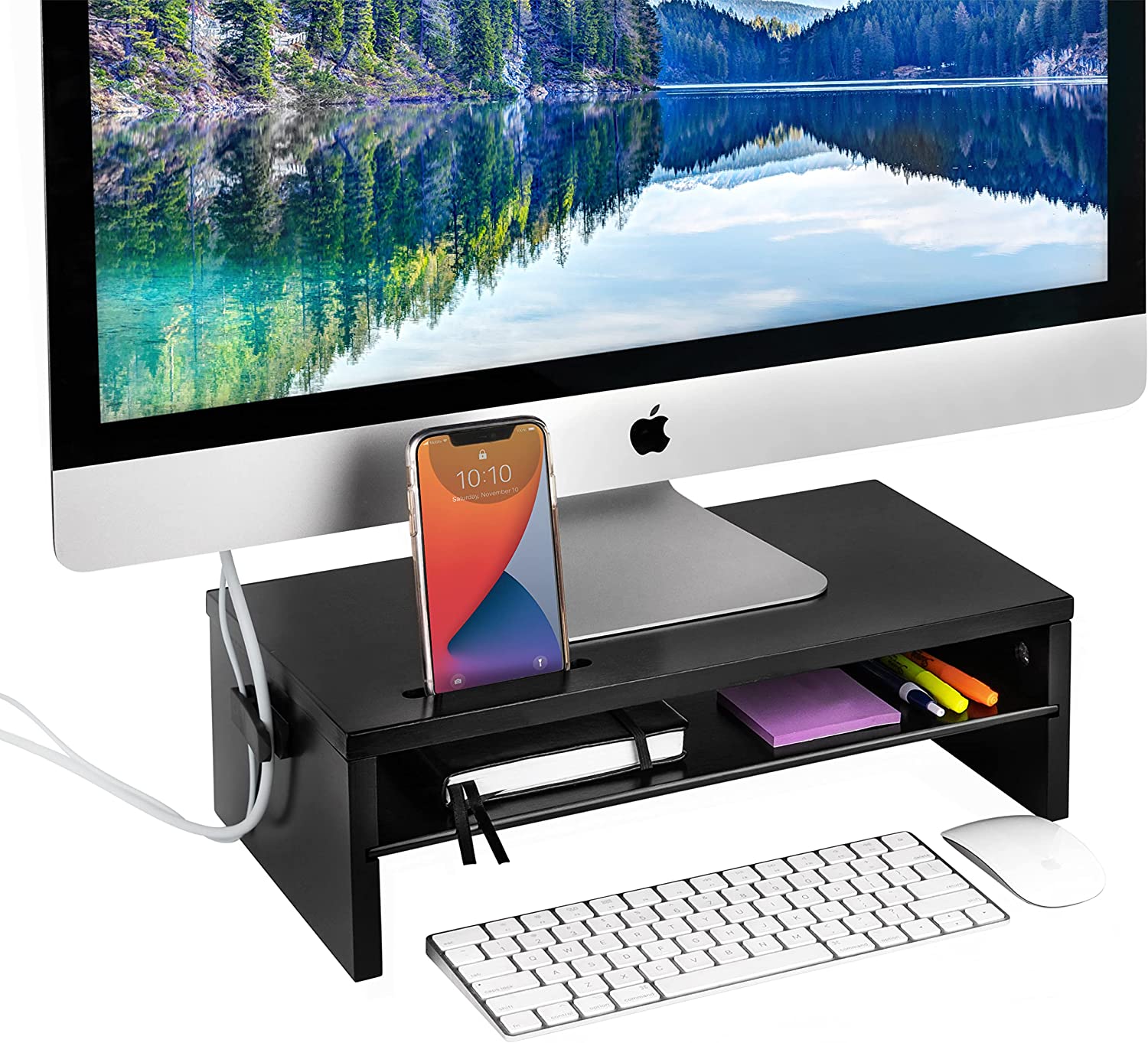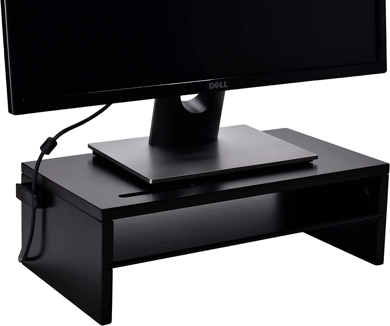 Monitor Stand - Two Tier Wood Desk Shelf for Monitor, Printer or Desktop Computer. Cable Management, Phone Slot and Removable Shelf for Organizing Office Accessories. (Black)