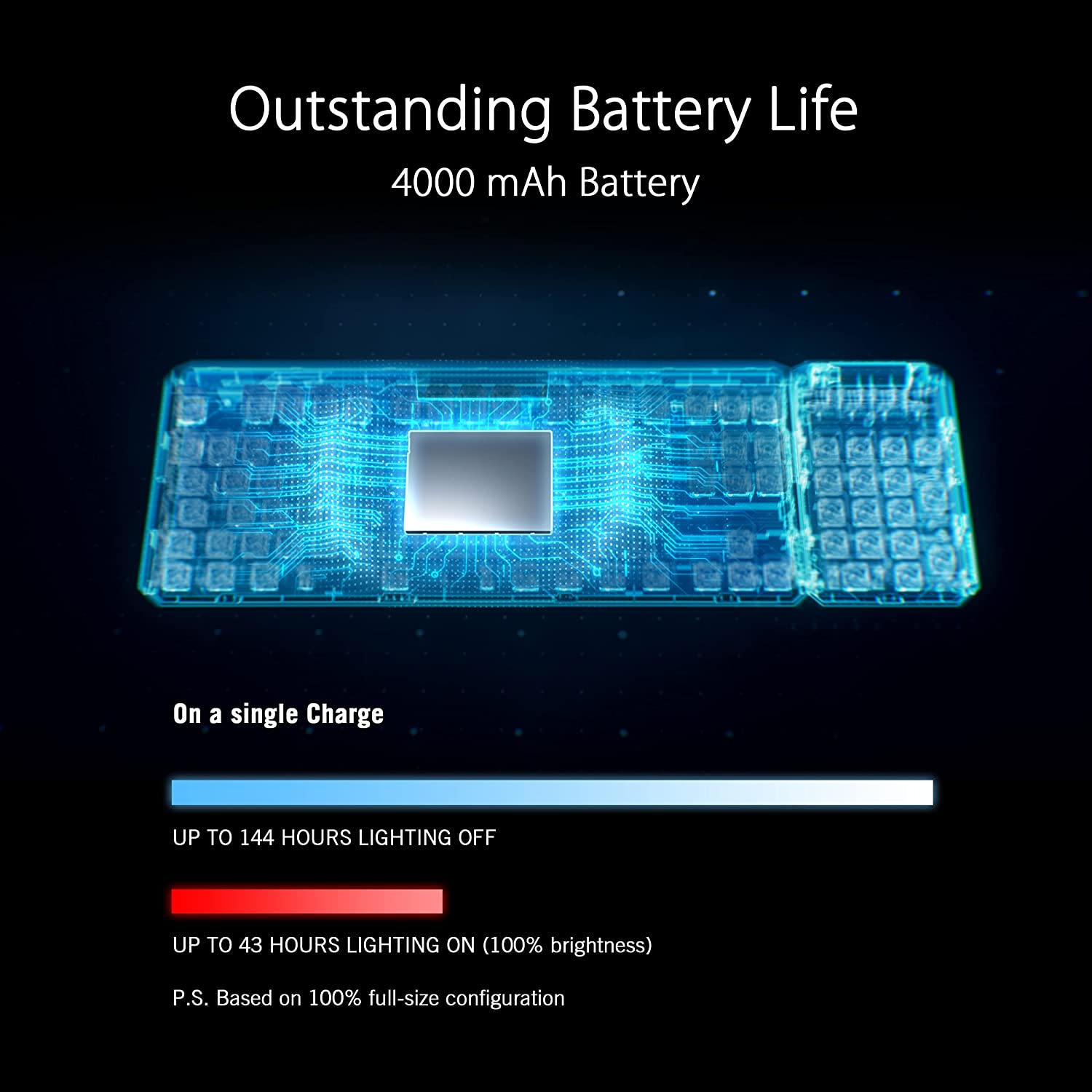 The ROG Claymore II elite gaming keyboard delivers a host of features designed to give you exciting new ways to play. Create your ideal gaming setup by placing the new detachable numpad on whichever side you prefer; then choose between wired or wireless mode and light it all up with Aura Sync. And once you’re in battle, assume full tactical control with ROG RX Optical Mechanical Switches and customizable hotkeys. The detachable numpad can be attached on either side of the keyboard, or it can be removed entirely if you prefer to use ROG Claymore II in TKL mode (80%). It can also be programmed to be used as a macro keypad for complex in-game commands. This flexibility gives you various combinations to suit your play style and gaming setup. ROG RX Red and RX Blue Optical Mechanical Switches offer consistent, wobble-free keystrokes with a superfast 1 ms response and 100-million-keystroke lifespan. These premium switches have a hollow-square stem design and they feature embedded RGB LEDs providing all-round per-key lighting. Play in wired or wireless 2.4 GHz RF mode, with a superfast 1 millisecond response time. A 4000 mAh battery and energy-efficient design give you up to 43 hours of nonstop gaming in wireless mode on a single charge, even with RGB lighting on. 30 minutes of USB-C fast charging* allows ROG Claymore II to be operated for up to 18 hours (lighting off). The fast-charge function can be switched off to use the provided USB passthrough for convenient connection to other devices. The detachable numpad includes four media control keys that can be programmed into hotkeys for convenient productivity shortcuts or macro in-game commands. There’s even a built-in control wheel for quick volume adjustment. With wireless Aura Sync RGB, the entire color spectrum and a range of dynamic lighting effects are at your command. Individually lit keys allow you to create a keyboard that’s uniquely yours. Customize and shine in your own way, wirelessly.