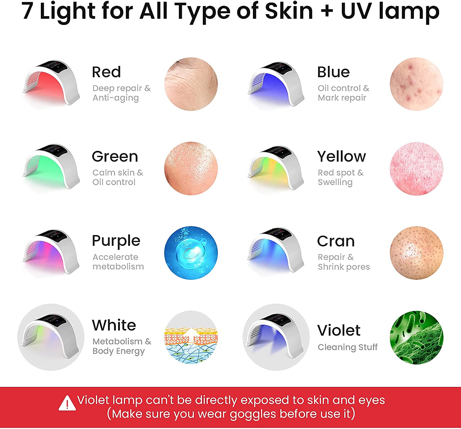【8 in 1 LED Light Therapy】: Red Light - For acne and repair skin; Blue Light - Calms and tightens skin; Green Light - Lightens scars and oil control; Yellow Light - Reduces redness and Freckle; Purple Light - Whitening and brightening; Cyanine Light - Soothing and wrinkles; White Light - Fine and smooth skin. Violet Light - Self-cleaning of the device.