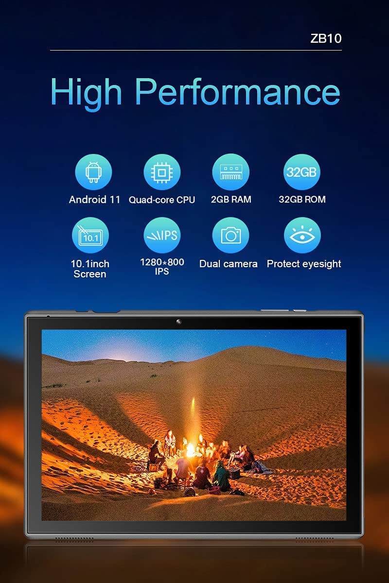 • 【Android 11.0 & High Performance CPU】 ZZB ZB10 tablet is equipped with high performance CPU Quad-core, adopting the Android 11.0 system with AI , all functions have been strengthened to next level, and can be operated even more swiftly. And with RAM: 2GB ROM: 32GB, you can feel the smooth operation. Perfect for watching videos, learning tools, and reading e-books.