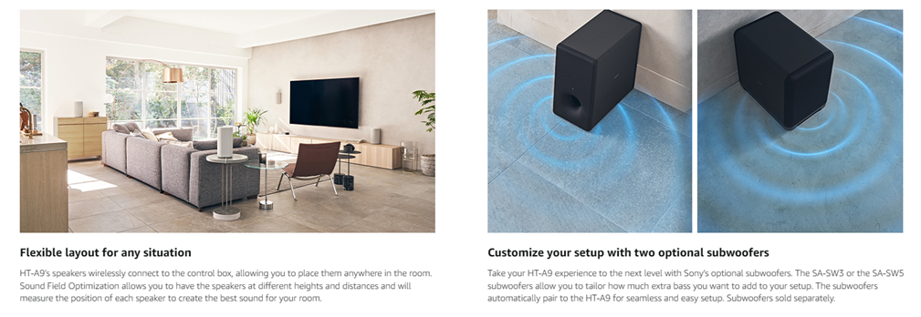 Immerse yourself in a multi-dimensional audio experience with the HT-A9 home theater system. Unique 360 Spatial Sound Mapping technology calibrates sound to your room for an environment that seems to expand beyond the walls. Support for 8K HDR, 4K 120p passthrough, and Dolby Vision video passthrough make your favorite movies and games sound out of this world.