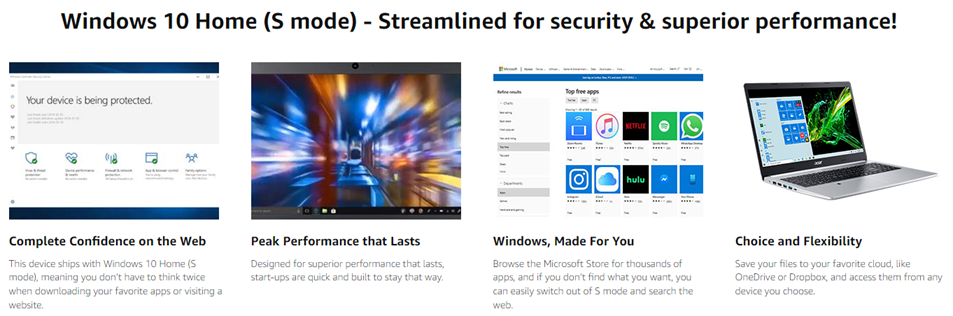 • With Windows 10 Home (S mode), you’ll experience fast start-ups, a familiar yet expanded start menu, and great new ways to get stuff done.