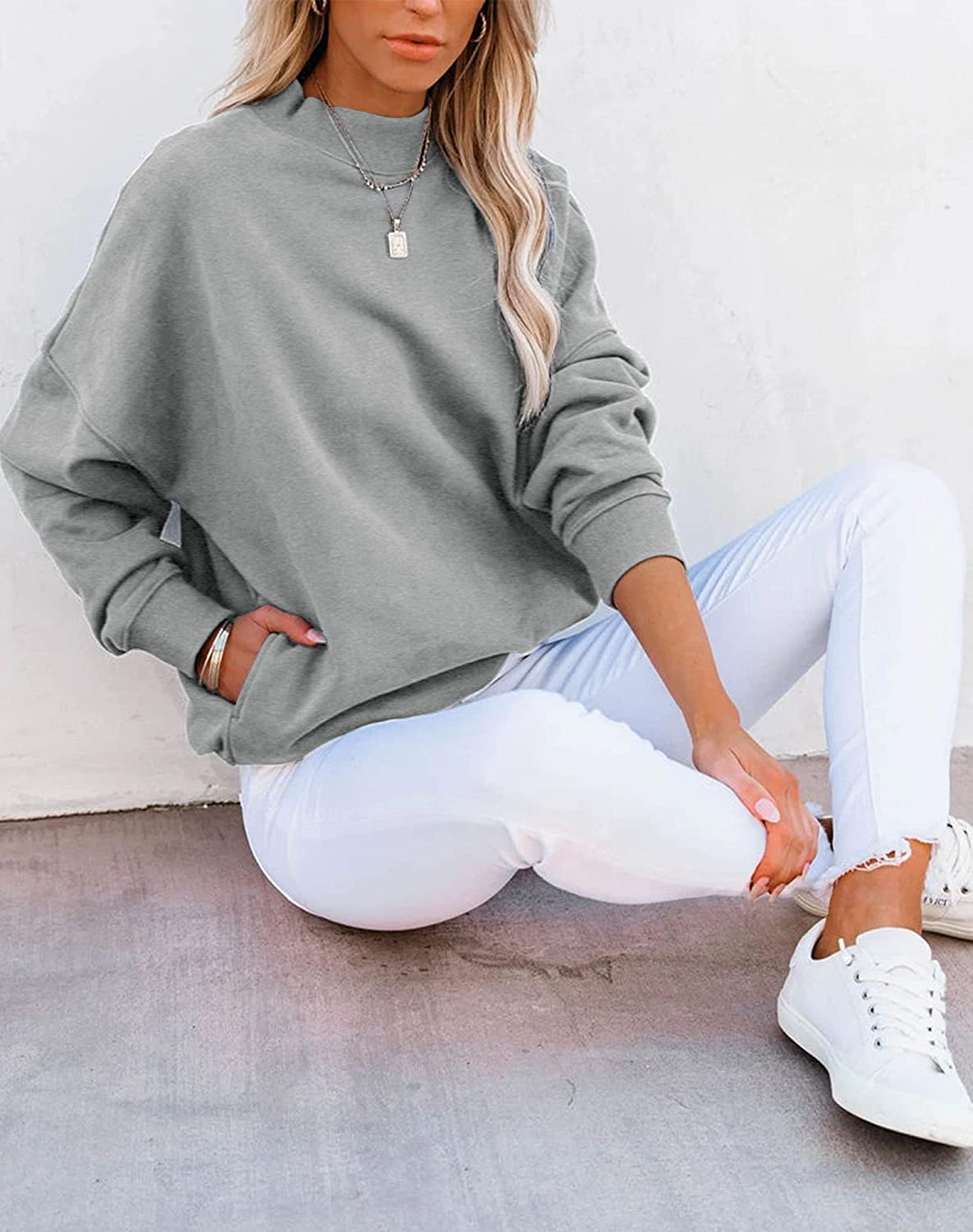 Features: Lightweight pocketed sweatshirt, basic solid color top, mock turtleneck, casual relaxed fit.