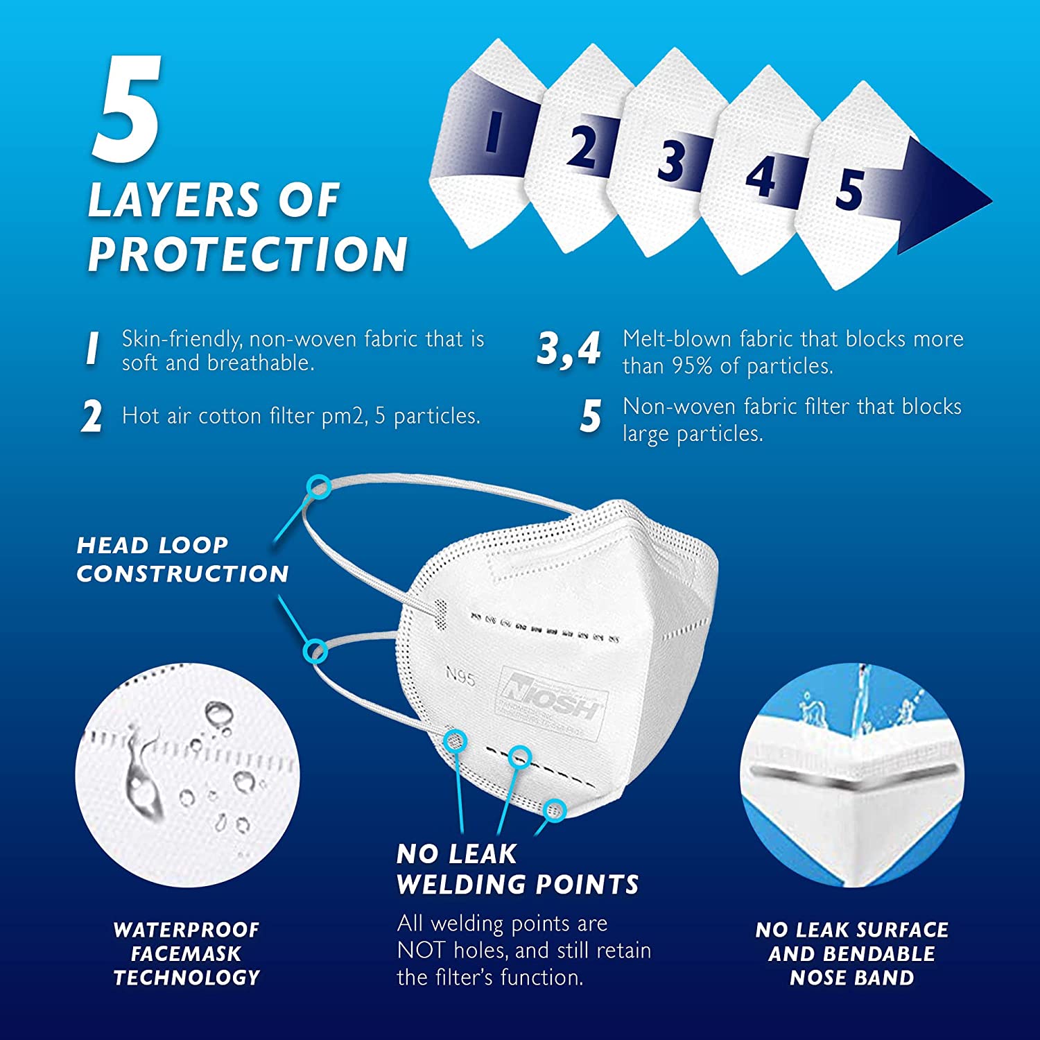 FIVE-LAYER DESIGN N95 filters with highly efficient filtering materials. Adjustable nose clip and ultrasonically welded headbands provide a tight and secure seal.