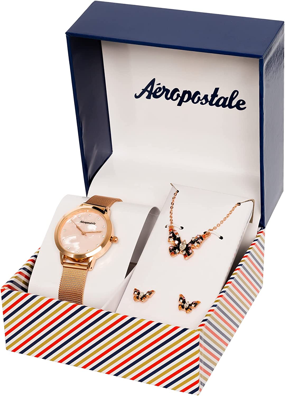 Aéropostale Simple Watch and Jewelry 4 Piece Gift Set Rose Gold Gold Gray 1 Watch 1 Matching Necklace 2 Matching Earrings