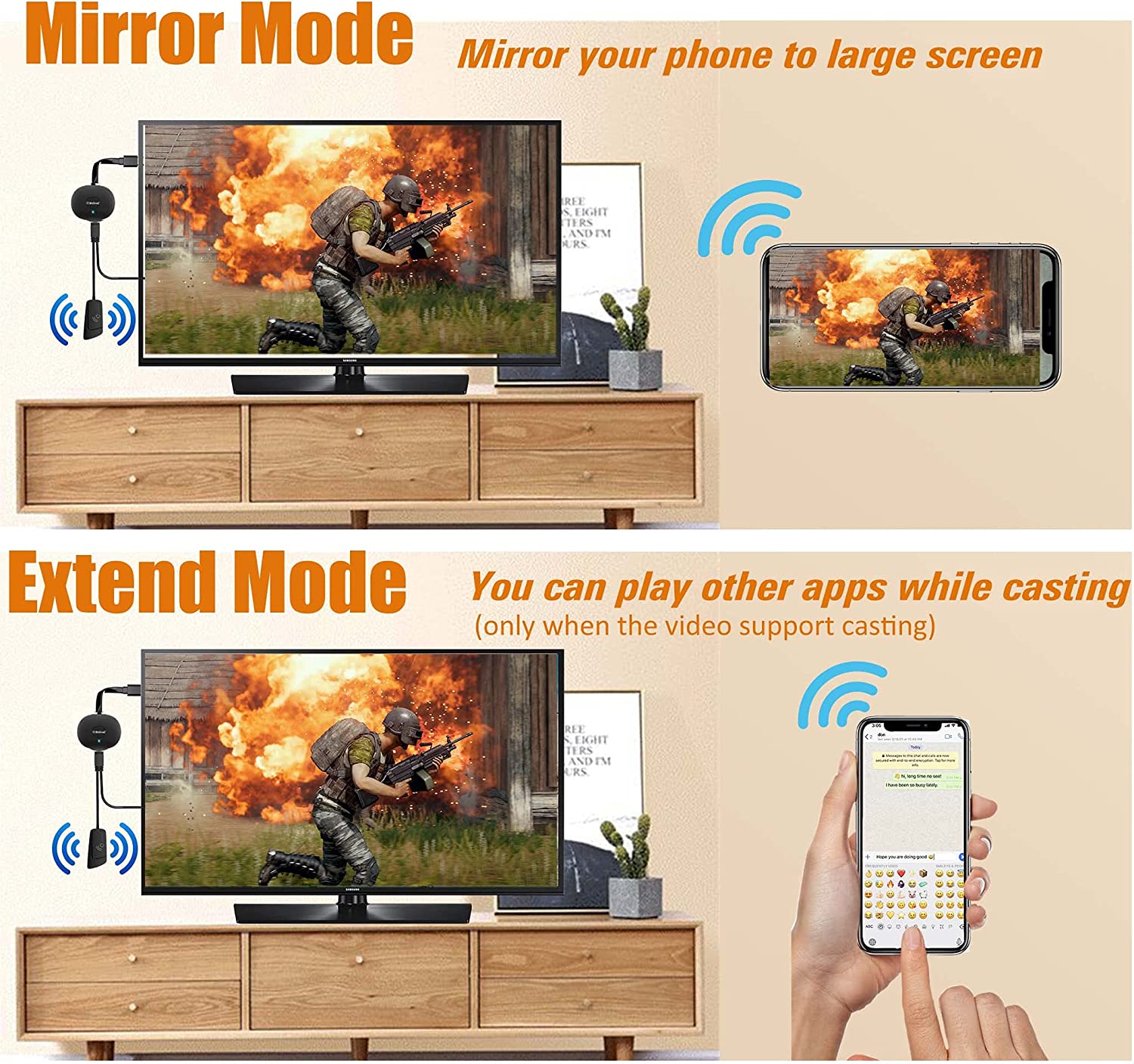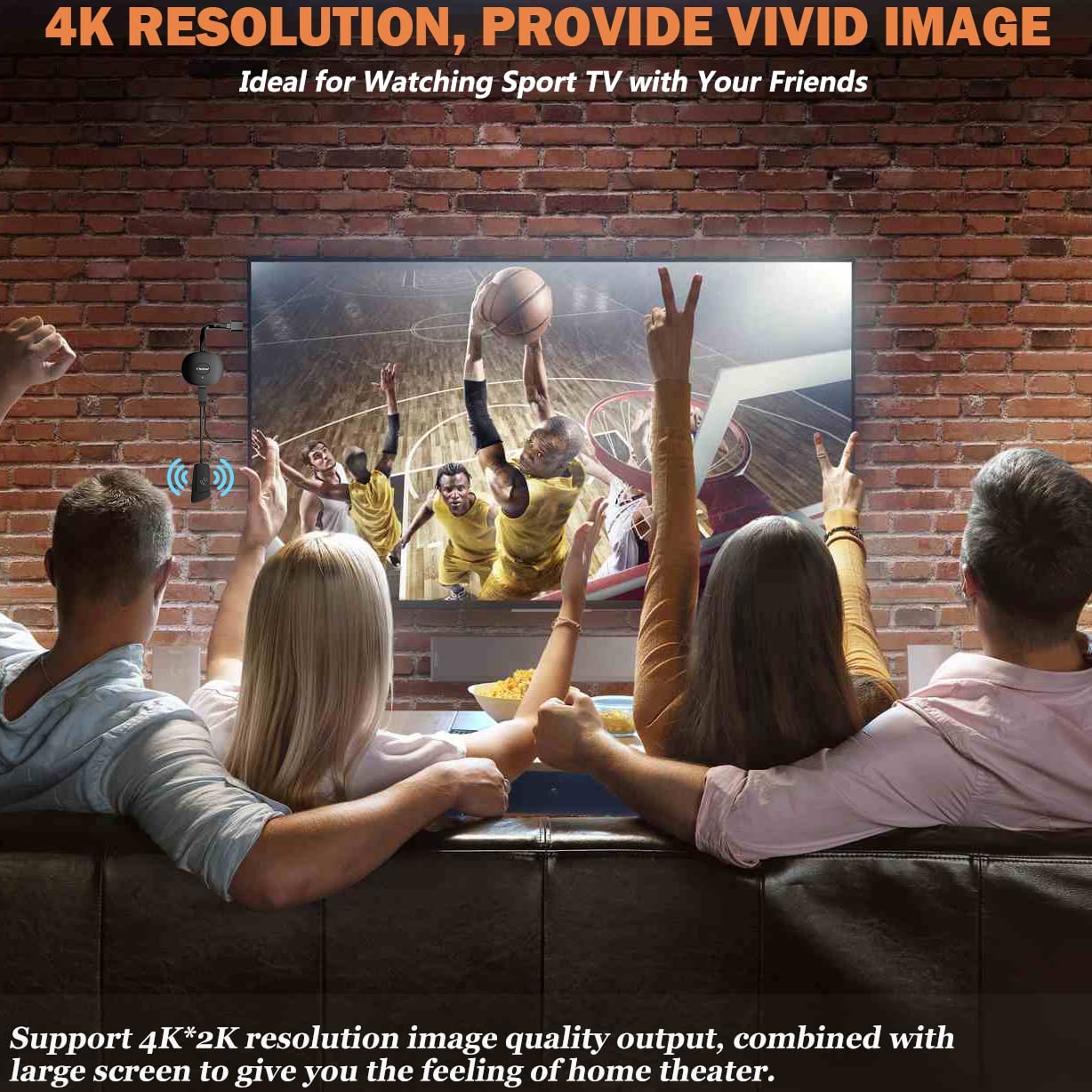 This TIMBOOTECH 4K wireless HDMI adapter can display every particle clearly, casting or mirroring movies/TV/video/audio/photos/music/games and presentations go to the big screen, suitable for home entertainment/ business/ educations/ training.
