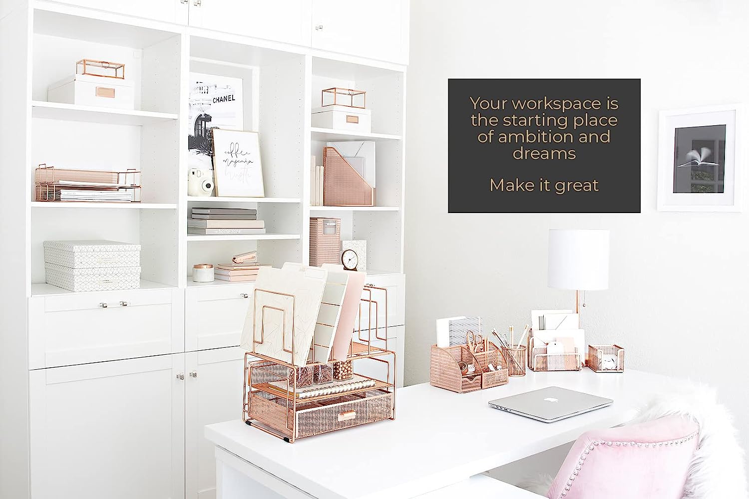 - PREMIUM QUALITY: Made of strong metal mesh and finished with rose gold paint, this File Organizer looks great on any desk! This all in one inbox organizer caddy will look great on a desk while also offering functionality and a modern look.