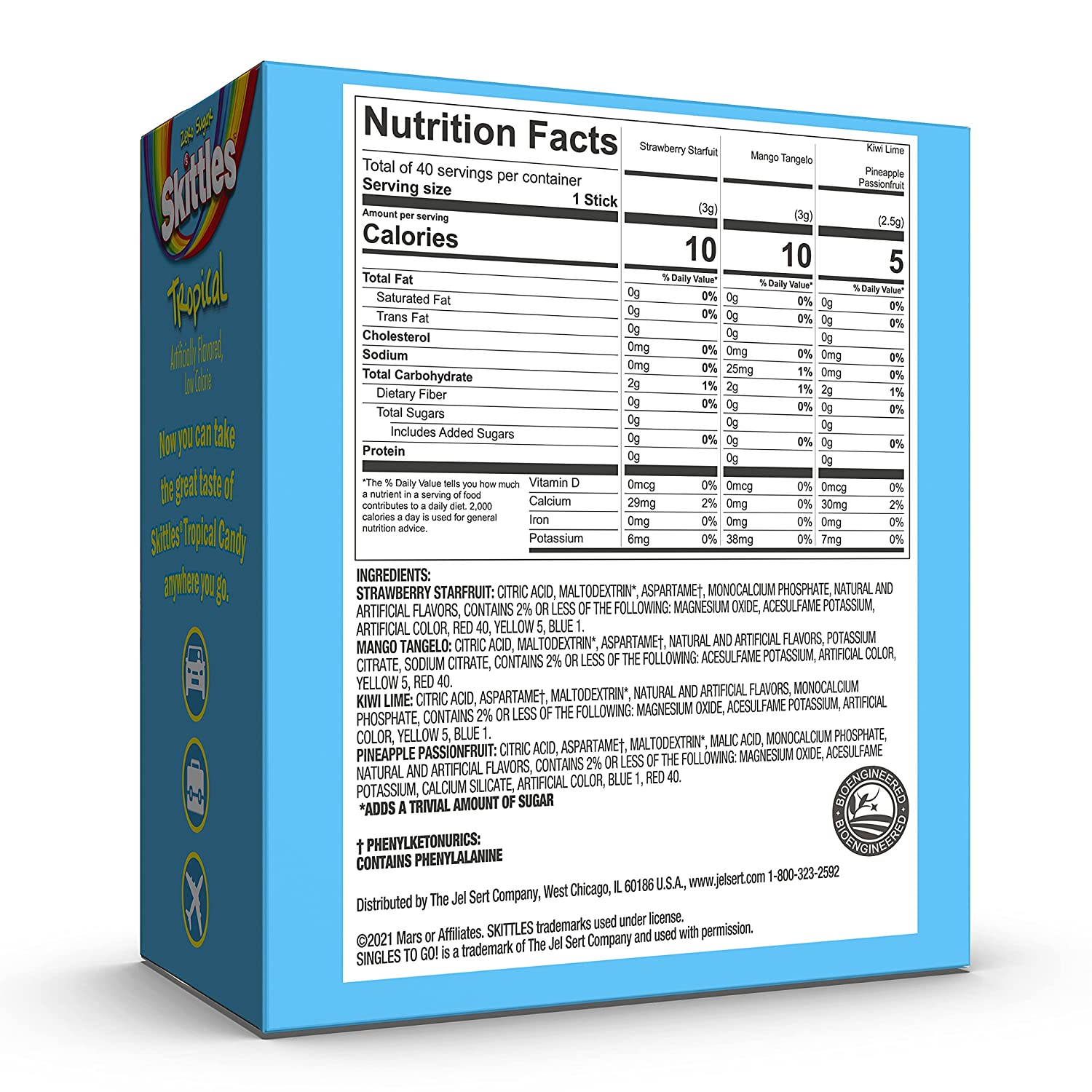 • SKITTLES SINGLES TO GO –Now you can bring the taste of the rainbow with you anywhere, anytime! Skittles Singles To Go drink mix sticks are bursting with fruit flavor that will add tasty excitement to your water.