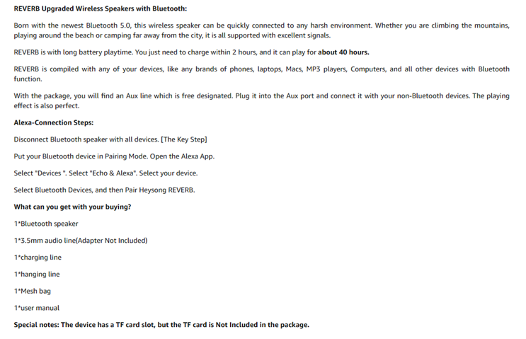 - [ Stable Bluetooth Connection and Multiple Usage Modes ]: Our speakers Bluetooth wireless can normally connect the device from 66 unobstructed feet away even under difficult conditions and the signal is not disturbed. HEYSONG Portable Bluetooth speaker supported to connect with all iOS Android devices, phone, computers and even echo Series, it supports three connection modes: Bluetooth, Micro SD card, Aux-In. Additionally, the built-in microphone for hands free calling mean more flexibility for you.