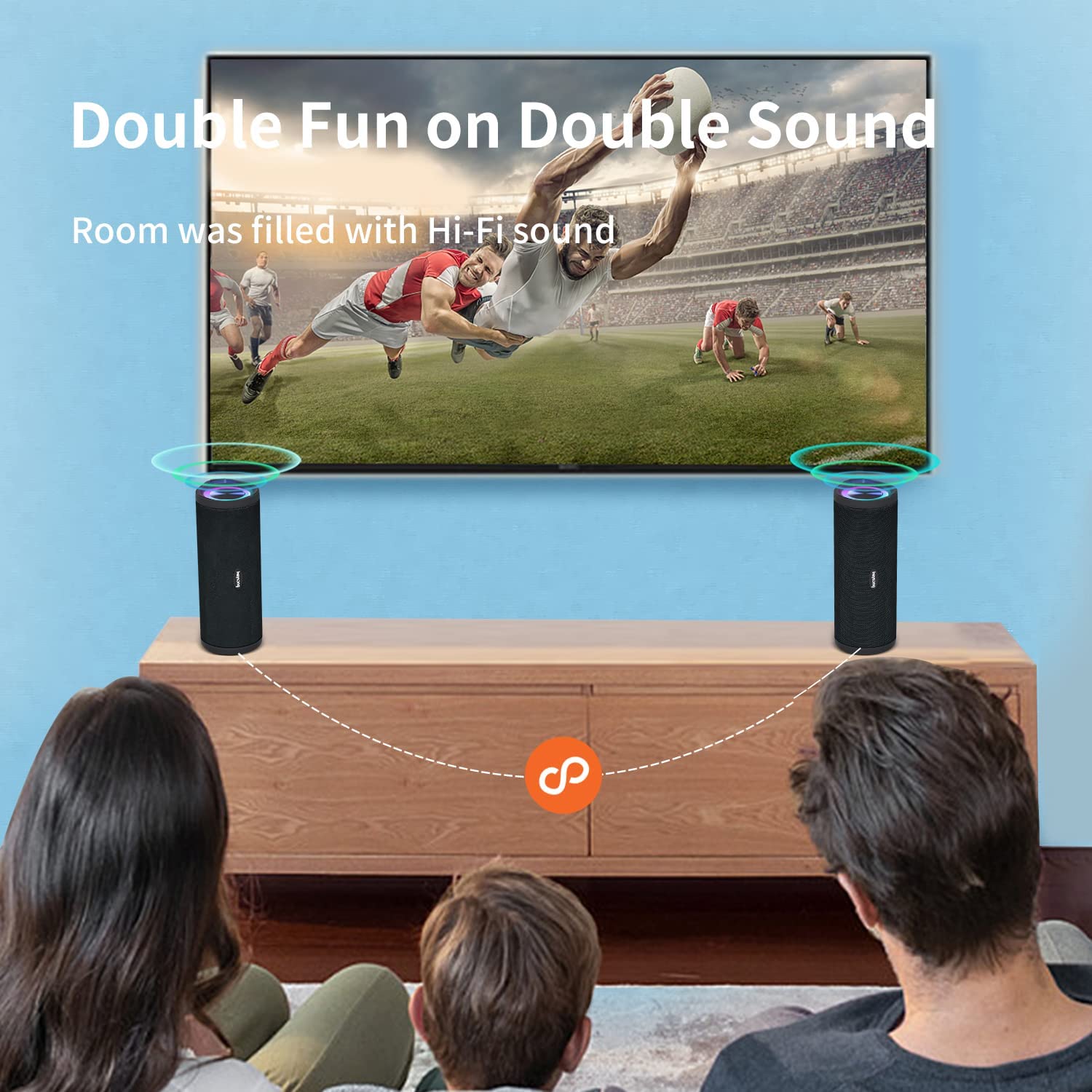- [ Superior Sound Quality and Dual Pairing Function ]: Immerse yourself in a truly immersive sound experience with our speakers bluetooth wireless that delivers stunning sound quality. Easily pair 2 wireless speakers with bluetooth together via Bluetooth to play the same music in perfect sync, double the volume, Enjoy up to 32W room-filling sound with punchy bass, strong midranges, and crisp highs. It is your perfect partner for playing games, listening to music enjoying audiobooks, and watching movies.