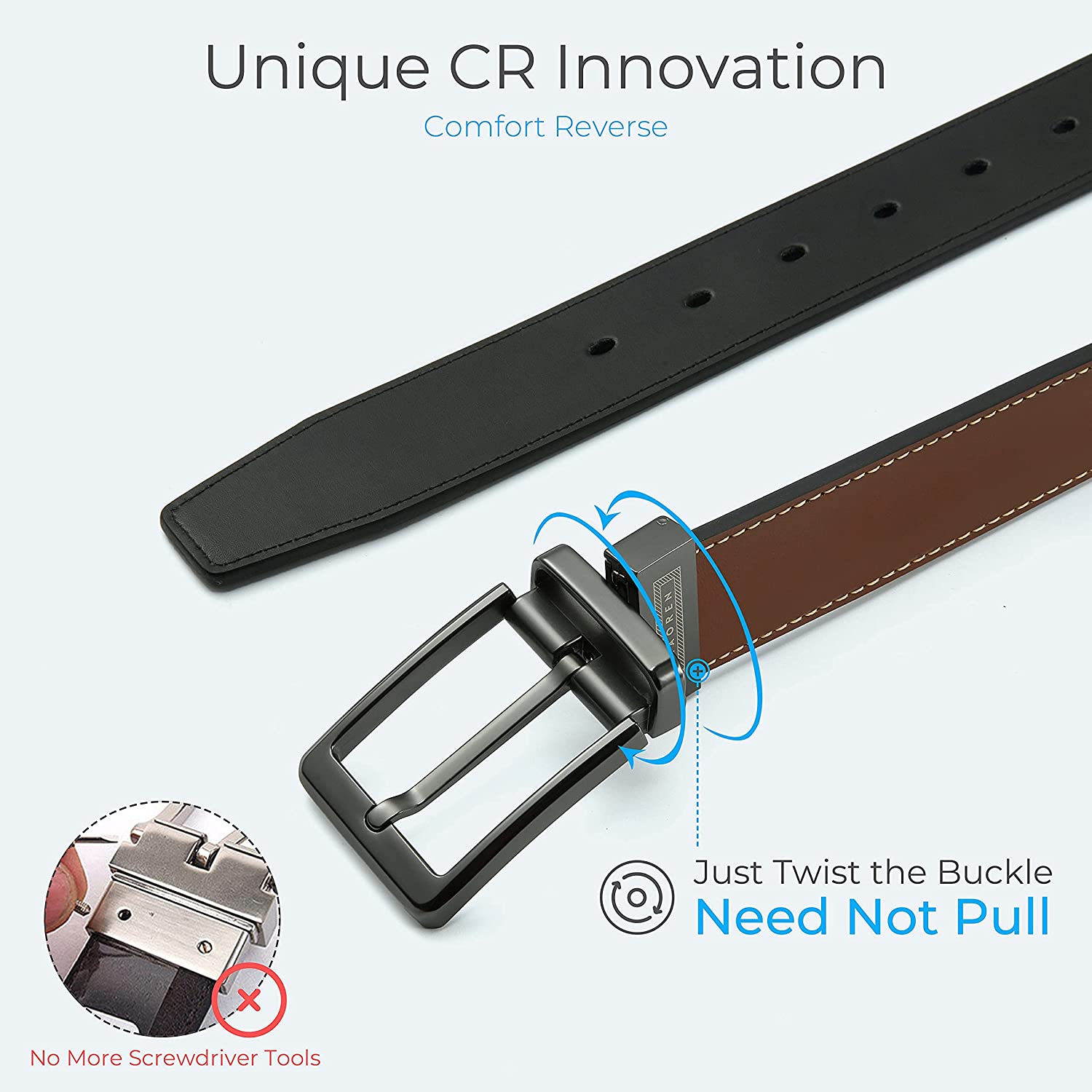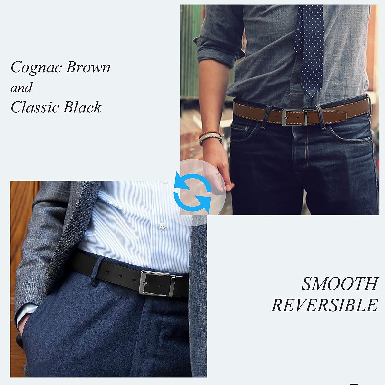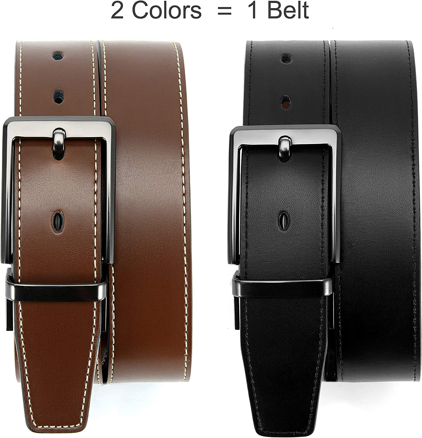 2-IN-1 VERSATILE STYLE - Pay for one but get two colors in one leather belt. The Classic design of the men’s belt is perfect to be paired with your favorite jeans, casual or dress pants. PERFECT FIT - Changing the design of the traditional double side, No-More-Screwdriver-Tools, you can easily trim to your exact size, especially for you with 33/35 waist.