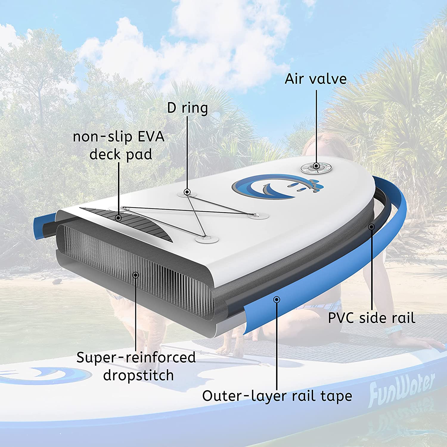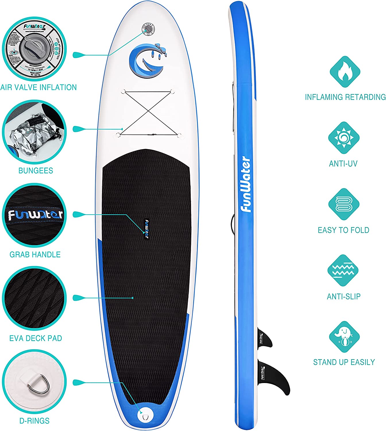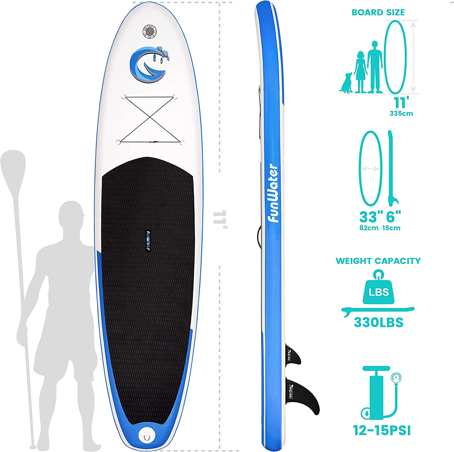 - 【Design and Use】Funwater's unique ergonomic handle design allows you to inflate your paddle more easily in a shorter time. The sensitive barometer ensures that you can read the sup inflation pressure value (12-15psi) at any time. The multifunctional elastic string can tightly fix any objects placed on the inflatable paddleboard. The multipurpose and ultra-large backpack can help you easily carry the paddle to any of your dream places.