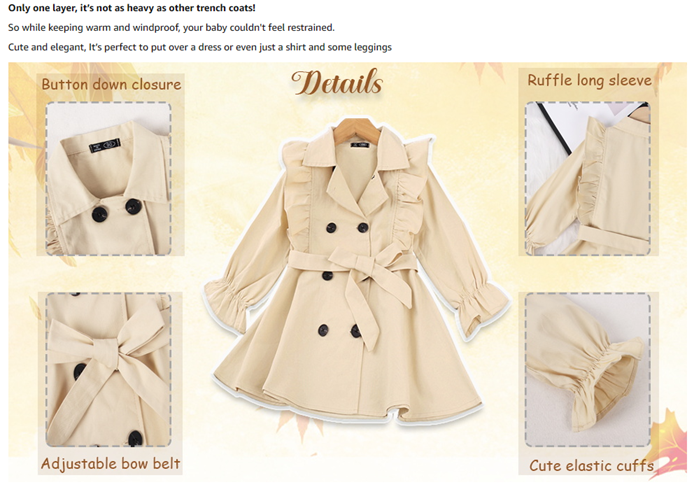 Feature: This baby girl's trench coat is button-down closure. Adjustable bow belt. Please notice that the jacket doesn’t have any belt loops to hold the belt. The tie around the waist is removable. You can also open it as a coat. Ruffle long sleeve. Elastic cuffs, Give your princess plenty of space to grow. Playful and adorable. Make your little girl adorable and charming, never out of style. A must-have for the princess autumn/winter wardrobe