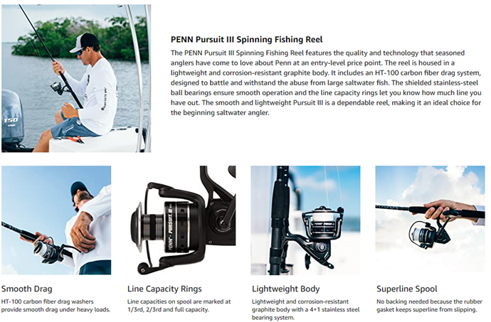 The PENN pursuit III spinning fishing reel features the quality and technology that seasoned anglers have come to love about PENN at an entry-level price point. The reel is housed in a lightweight and corrosion-resistant graphite body. It includes an HT-100 carbon fiber drag system, designed to battle and withstand the abuse from large saltwater fish. The shielded stainless-steel ball bearings ensure smooth operation and the line capacity rings let you know how much line you have out. The smooth and lightweight pursuit III is a dependable reel, making it an ideal choice for the beginning saltwater angler. The PENN Pursuit III features a durable construction and the smooth gear system anglers expect from PENN. Available in six sizes from 2500 to 8000, the Pursuit III has a reel for most fisheries.