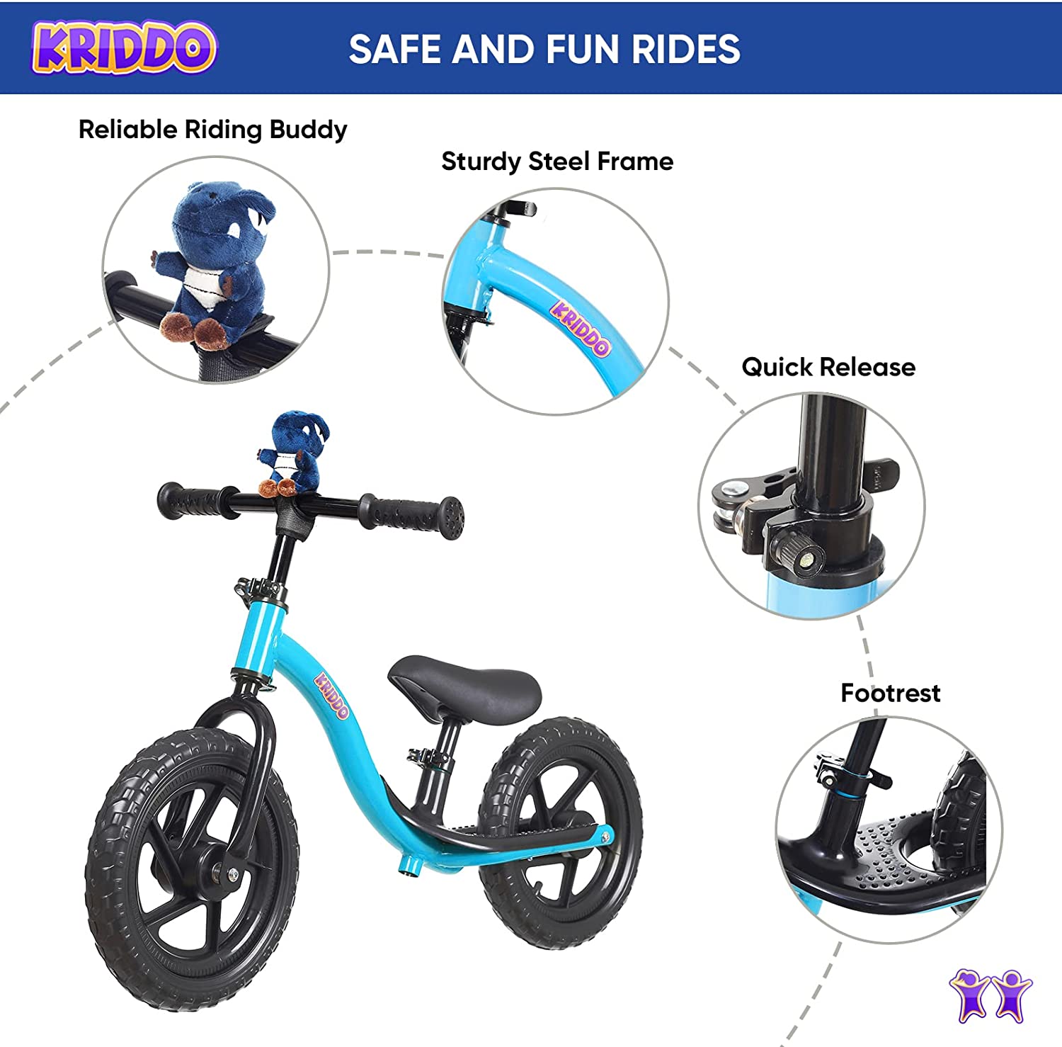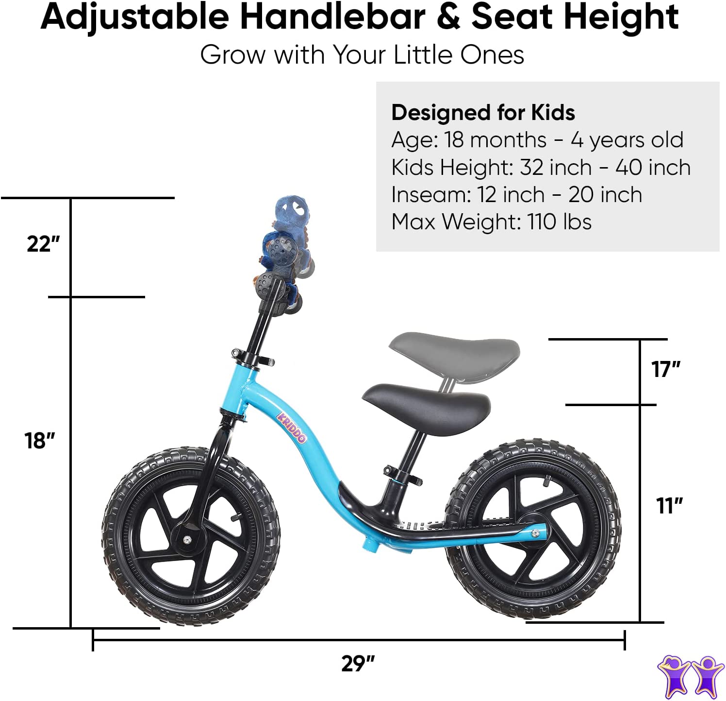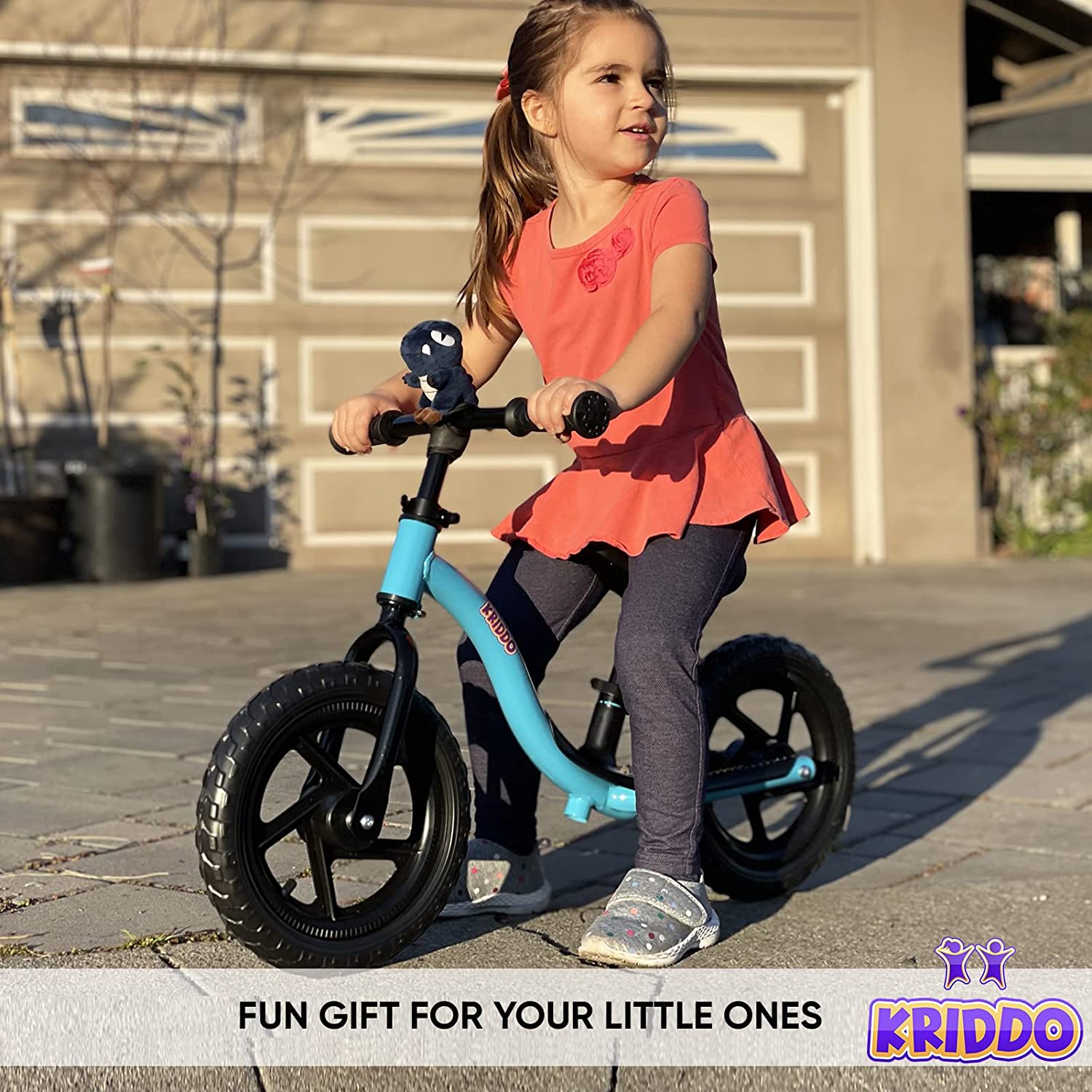 We developed the KRIDDO Balance Bike for ages 18 months to 5-years old to help young boys and girls learn about bike riding by pushing themselves along and gliding without relying on pedals. Fun and easy to use on all types of terrain, these easy-push balancing bikes even come with a stuffed animal toy that sits right up on the front handlebars to join them on every exciting ride.