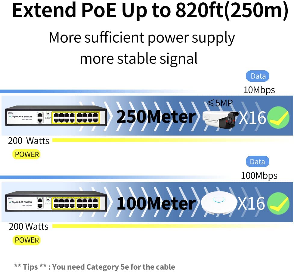 【18 Gigabit ports @240W 】16 Gigabit PoE ports +2*1000Mbps Uplink ports,Poe single port can provide up to 30W, total PoE budget 240W.