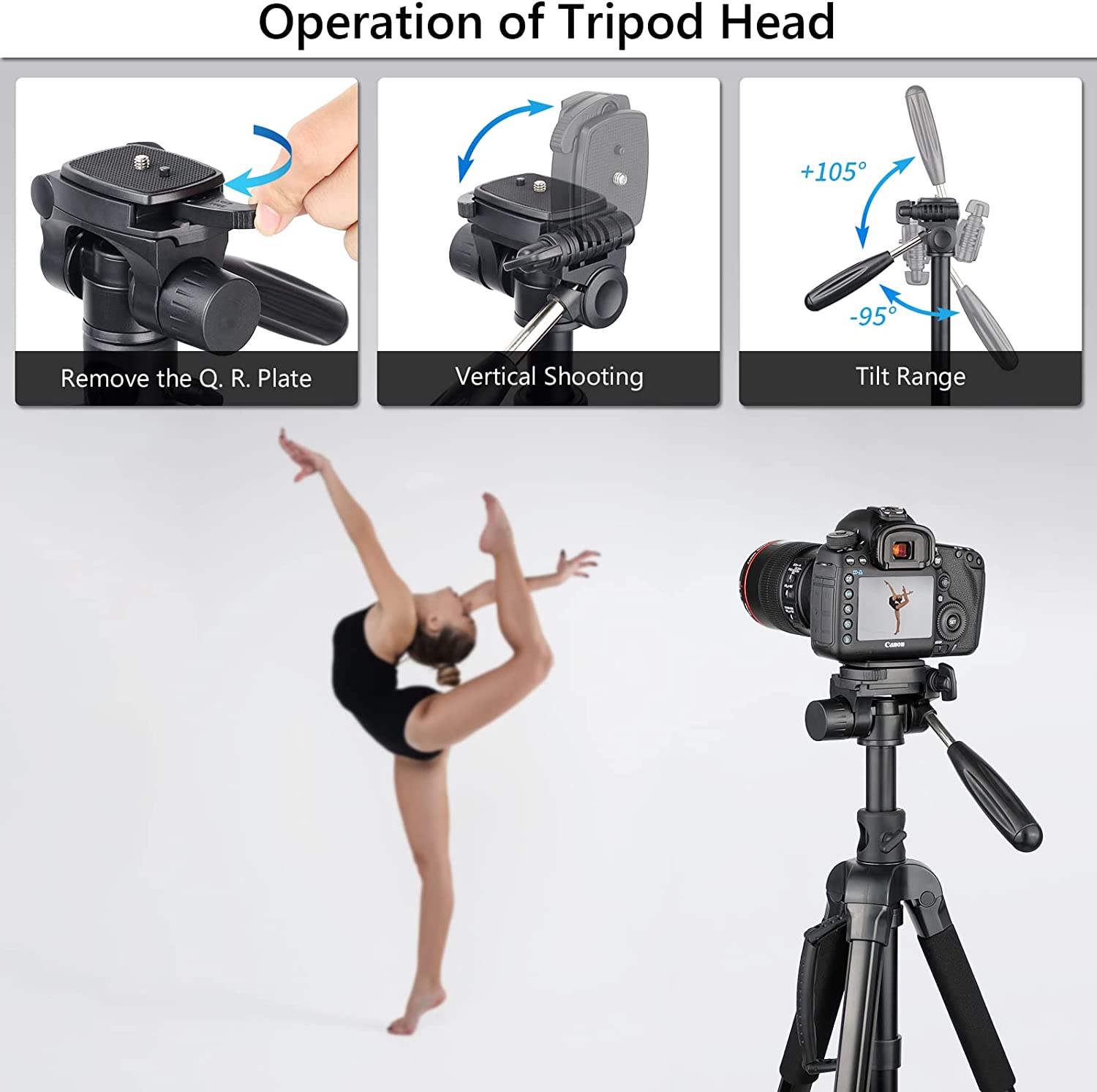 【Widely Compatible Multifunctional Tripod】The 1/4" screw on the top of the quick release plate is compatible with a variety of devices, including mobile phones, cameras, GoPro, webcams, ring lights, etc. You can install them on a tripod at the same time to easily get a free angle.