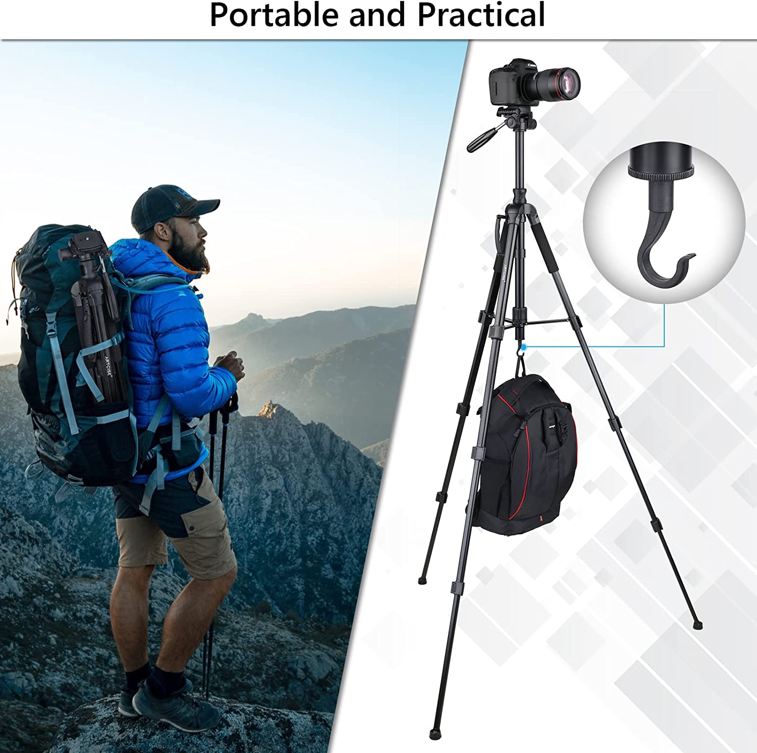 【Tripod & Monopod Function】 The ZF20 tripod center column can be quickly disassembled into a monopod to meet your different shooting needs. With a maximum height of 71 inches/180 cm, the monopod can be used as a hiking pole, perfect for outdoor activities and long trips.