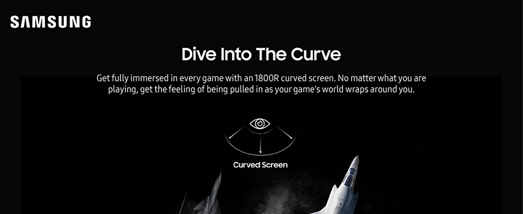 Samsung CRG5 Curved Gaming Monitor allows gamers to get fully immersed in with the1800R curved screen. No matter what you are playing, get the feeling of being pulled in as your game's world wraps around you, and enjoy smooth and clear action every moment. A refresh rate of up to 144Hz puts you ahead, even in the most demanding games. Spot the enemy instantly and notice tiny crucial changes in every scene. Get ideal settings for your game with exclusive gaming features. Game Mode optimally adjusts black gamma levels, contrast, sharpness, and color for any game genre. Low Input Lag Mode minimizes delays between your input devices and display. Virtual Aim Point centers the target on the screen for more precise attacks on the enemy. No more choppy gameplay. AMD Radeon FreeSync™ eliminates image tears for exceptionally smooth, fast-action gaming. With a dynamically adapted display refresh rate, even the most complex game scenes are seamless and virtually stutter-free. Play for even longer. Eye Saver Mode minimizes blue light enough to keep eyes relaxed and comfortable when gaming for extended periods. Flicker Free technology continuously removes tiring and irritating screen flicker so you can focus longer with less distraction or eye strain. Give them nowhere to hide. A whopping 3000:1 contrast ratio lets you see dangerous objects or enemies with greater clarity. Blacks are deeper and whites are brighter with more levels of shades in between. Even when enemies hide in the dark, you can spot them quickly, before it's too late.