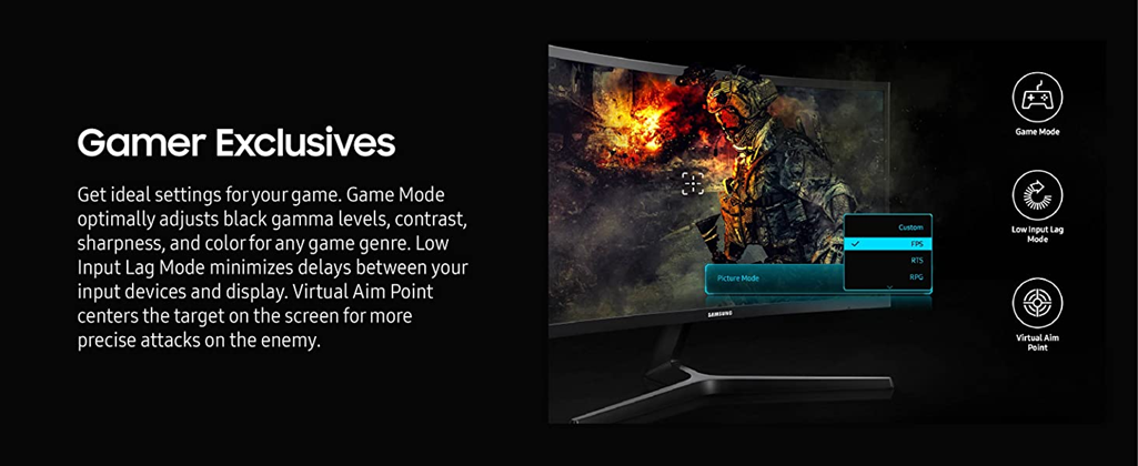 • EXCLUSIVE GAMER FEATURES: Game Mode adjusts black gamma levels, contrast, sharpness, and color for any game genre; Low Input Lag Mode minimizes delays between your input devices and display; Virtual Aim Point centers the target on the screen
