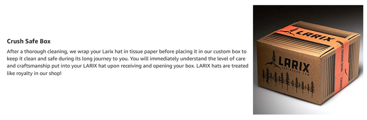 - SHIPPED IN BOX : After your hat has been cleaned and prepped we wrap your Larix hat in tissue paper before placing it in our custom box to keep it clean and safe during its long journey to you. IF YOUR HAT DOESN'T ARRIVE IN A BOX PLEASE REACH OUT TO US DIRECTLY TO LET US KNOW. You will immediately understand the level of care and craftsmanship put into your Larix hat upon receiving and opening your box.