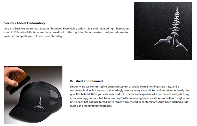 - SERIOUS ABOUT EMBROIDERY : Every Larix hat is embroidered right here at our shop in Columbia Falls Montana by us. It's our highest priority to achieve outstanding results by using the most advanced sewing technology and techniques available today.