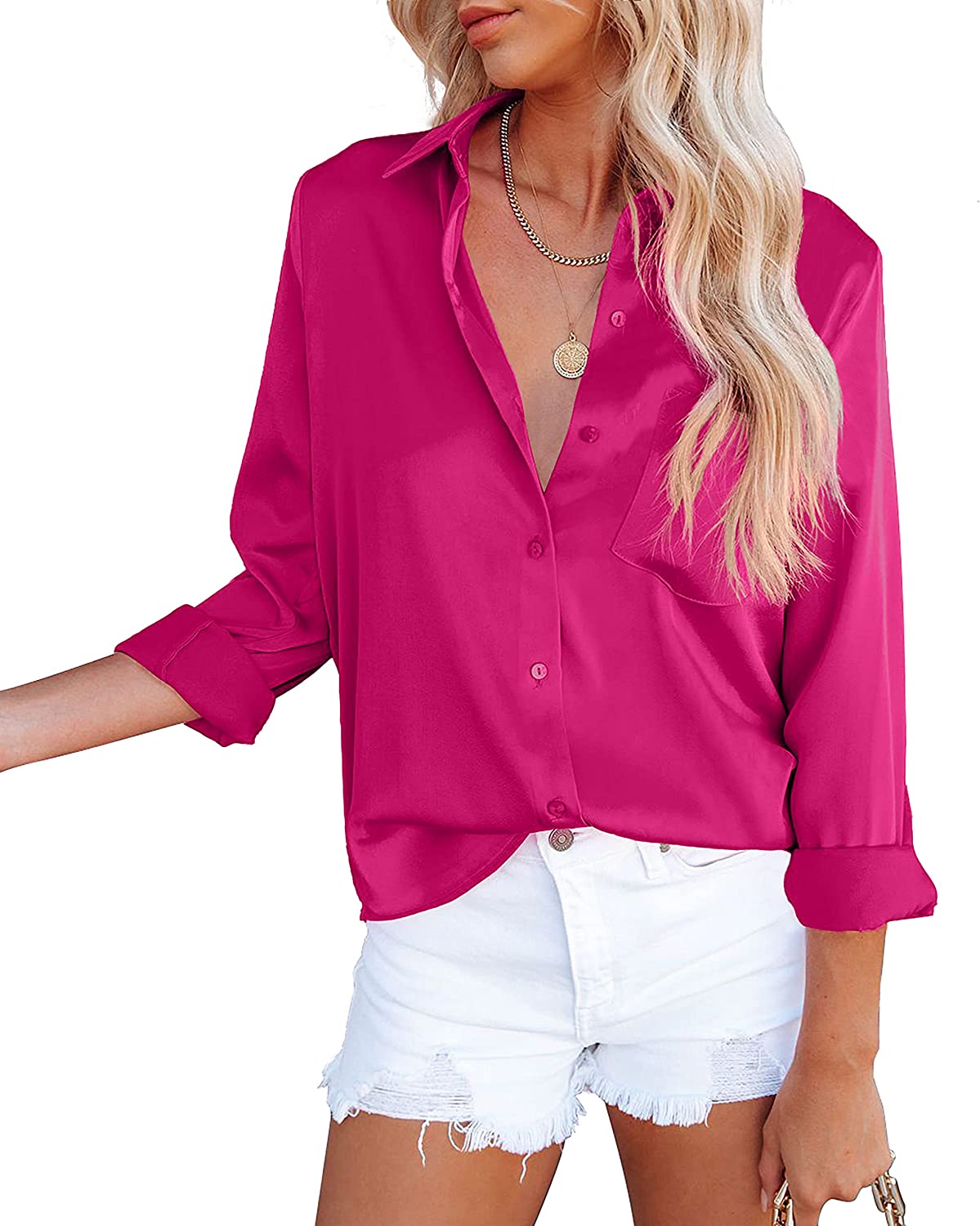 Button down long sleeve shirts for women, v neck, pocket design, solid color, long sleeve, satin fashion blouse tops for women