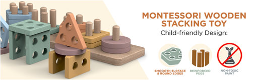 - ??? CHILD-SAFE DESIGN - Our wooden montessori shape sorter toy is made of lightweight natural woods covered with smooth non-toxic water paint. Unlike other montessori toys on the market our wooden stacking puzzle has smooth surface, reinforced pegs and rounded edges - protects the little hands from scratching. This very important detail eliminates the risk of your child being injured and offers complete safety to both the child and the parent!